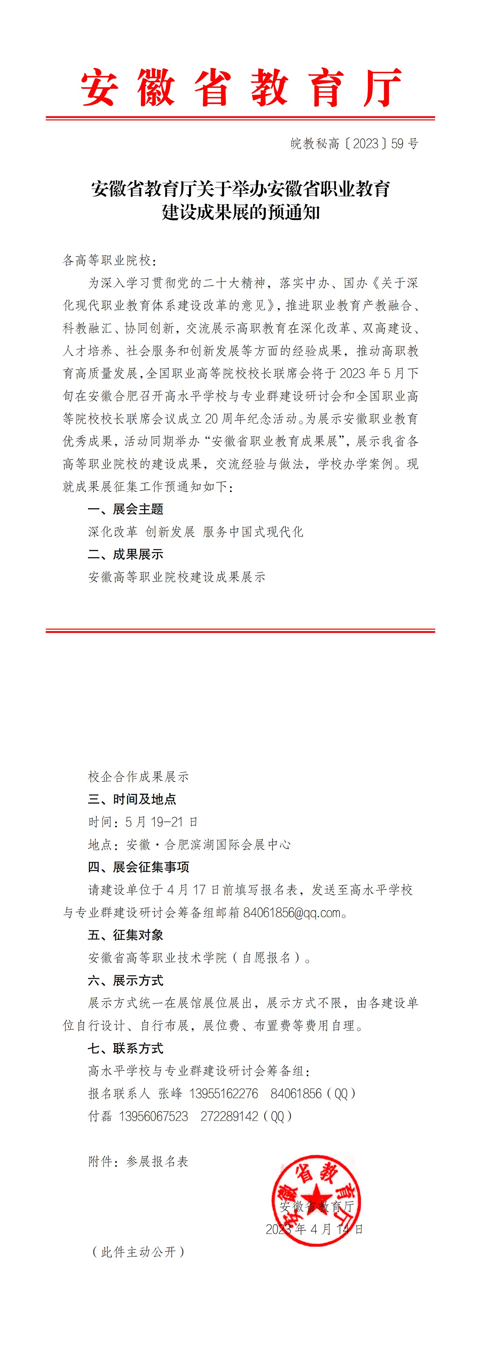 安徽省教育厅关于举办安徽省职业教育建设成果展的预通知