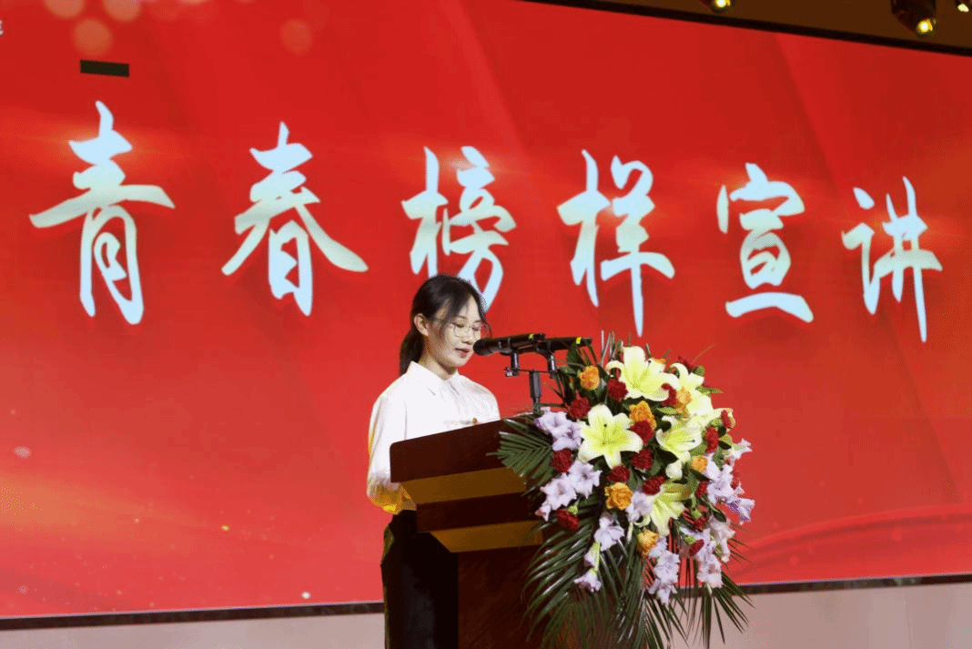安庆市青年岗位能手陈梦;校青马班学员、安徽省“振兴杯”青年职业技能大赛获奖代表宋海滨分别作为优秀青年师生代表作青春榜样宣讲。