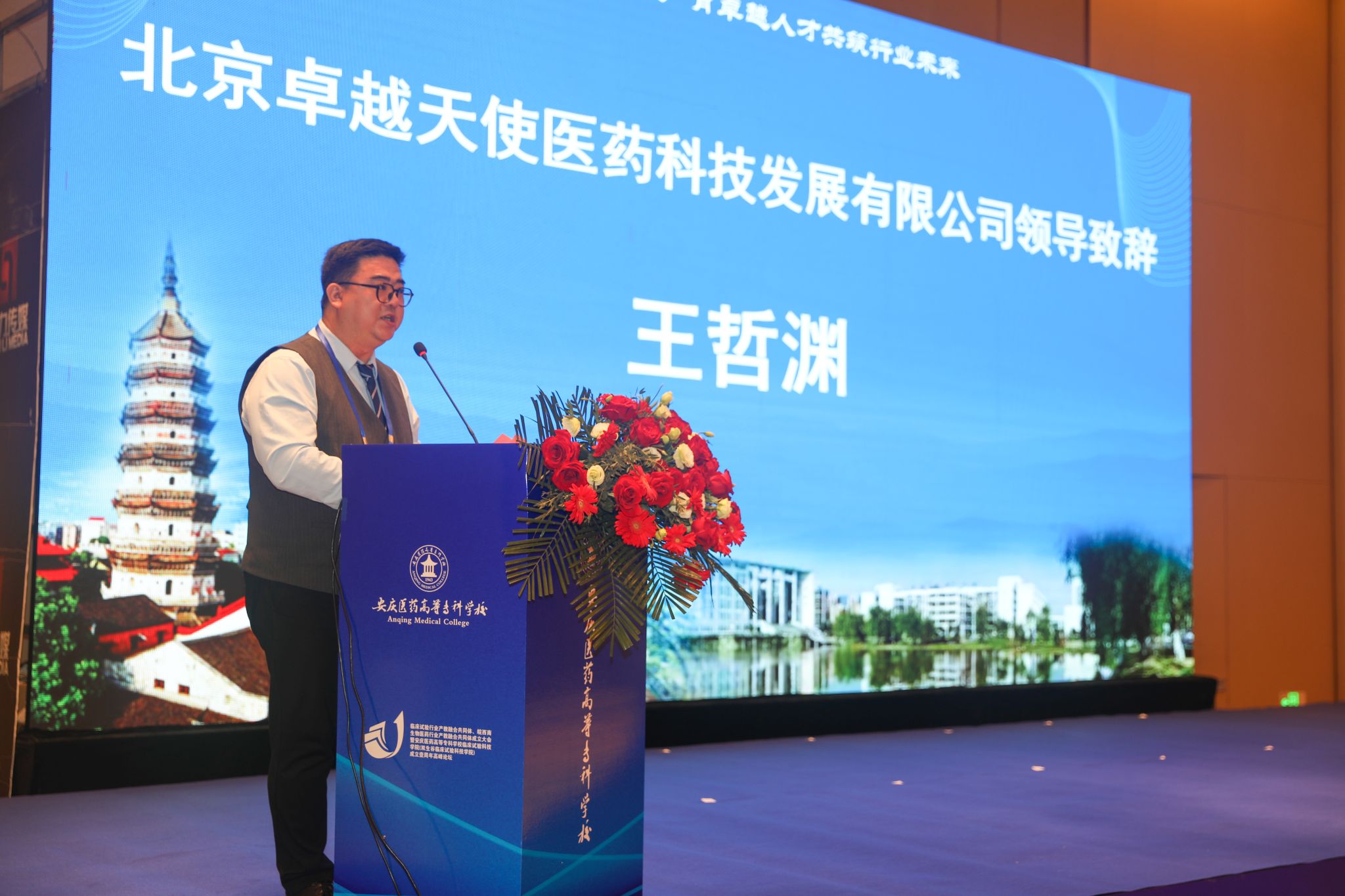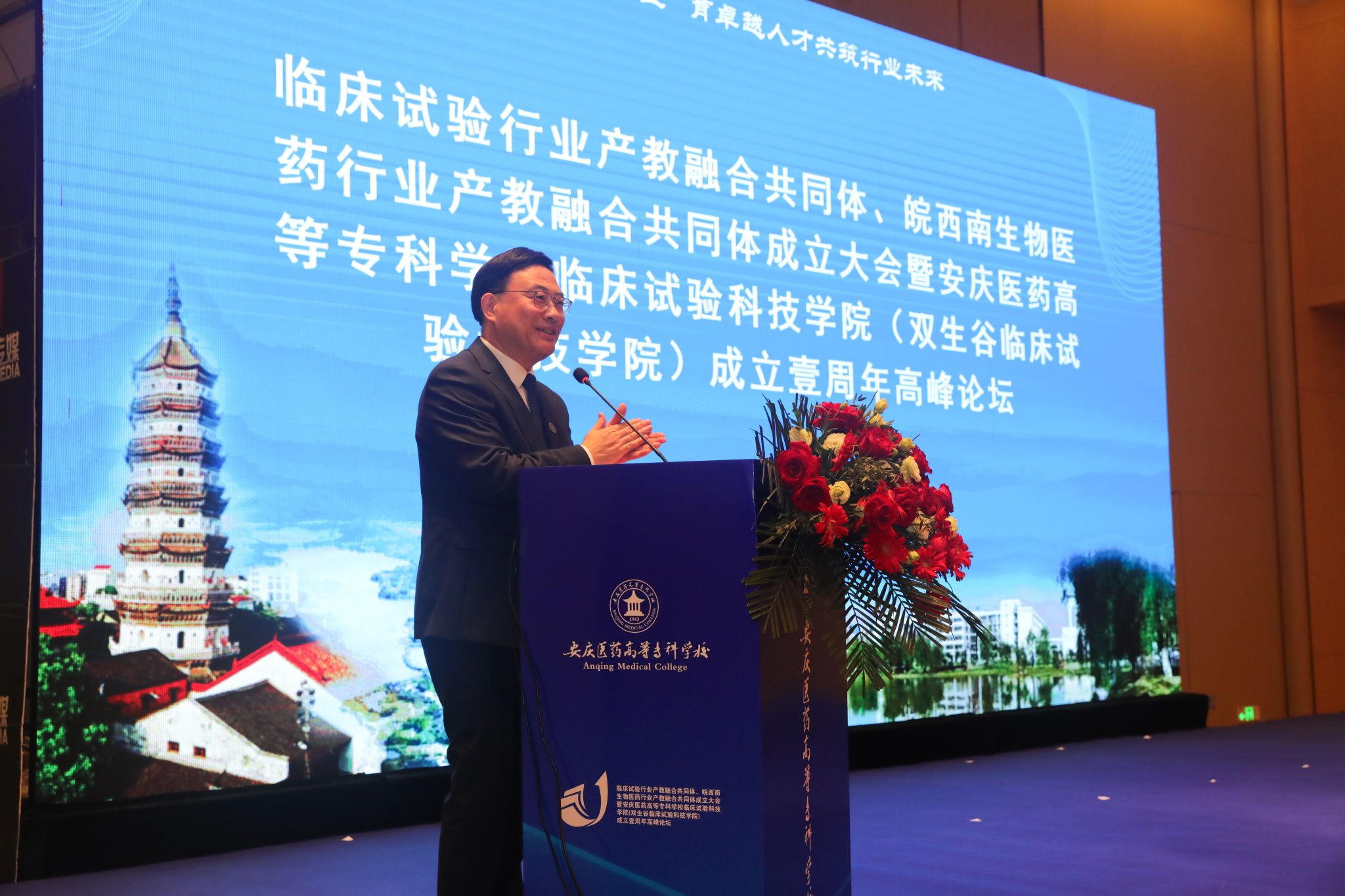 省教育厅高教处副处长苏石,安庆市人大常委会党组成员、副主任叶林霞,蚌埠医科大学党委常委、副校长陈昌杰,安庆师范大学党委常委、副校长吴琼,安庆市科学技术局党组书记、局长谢文婕、市经济和信息化局党工委书记、局长吴爱德、市民政局局长蔡婷婷、市卫生健康委员会党组书记、主任张贤惜、市市场监督管理局党组书记、局长焦玲,联环药业(安庆)有限公司总经理潘和平、北京卓越天使医药科技发展有限公司总经理王哲渊、北京赛德盛医药科技股份有限公司董事长汪金海、华中科技大学同济医学院附属协和医院学科建设处处长、药物临床试验机构办主任吴建才、浙江大学申屠建中教授出席会议,市教体局、市人社局、高新技术产业开发区管理委员会,市双生谷发展运营中心等市直相关单位领导,相关高校领导、专家,相关行业组织、医院、企业负责人,学校领导及师生代表200余人参加会议。会议由校党委副书记、校长朱庆丰主持。