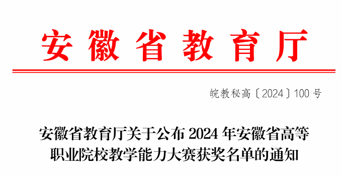 近日,安徽省教育厅公布了2024年安徽省职业院校教学能力大赛获奖名单。我校教师凭借良好的团队精神,扎实的教学功底,喜获二等奖1项,三等奖4项。