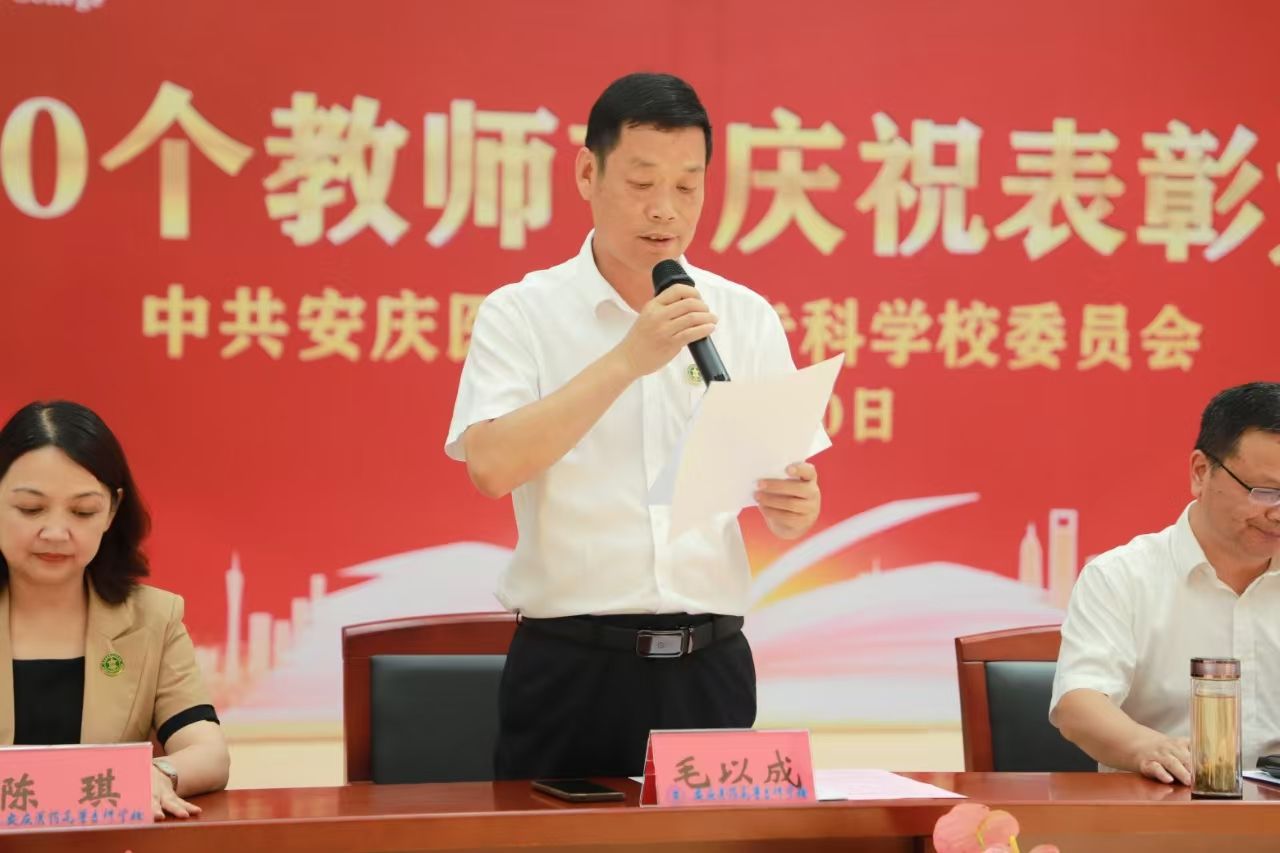 副校长毛以成宣读《关于公布安庆市2024年教师节评优结果的通知》和《关于表彰2024年优秀教师、先进教育工作者和优秀辅导员的决定》。校领导对10名市级表彰对象,全校38名“优秀教师”、23名“先进教育工作者”和8名“优秀辅导员”进行表彰。