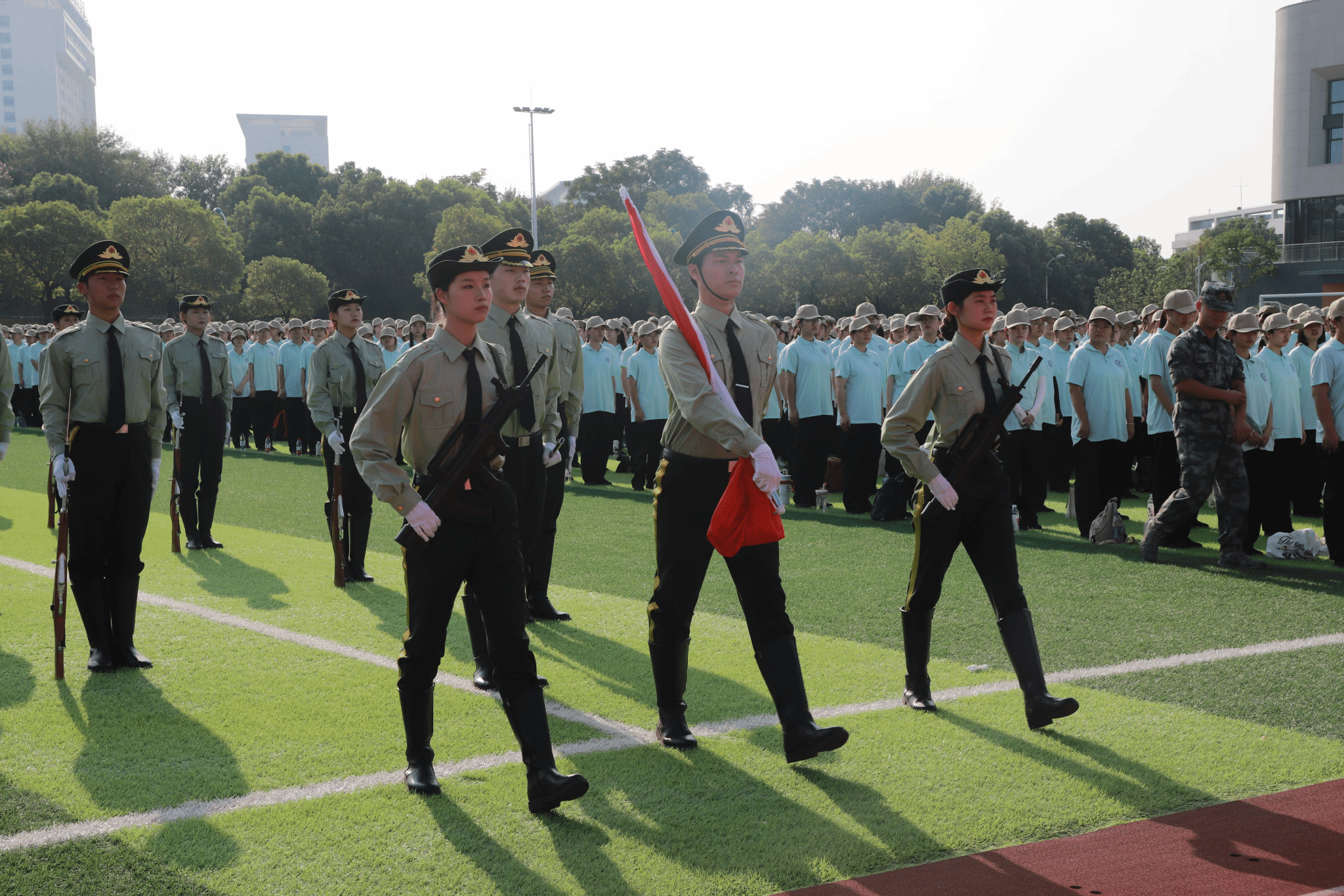 2024级新生军训开训仪式在雄伟的国歌声中拉开序幕。伴随着嘹亮的国歌声,鲜艳的五星红旗冉冉升起,全体人员行注目礼。