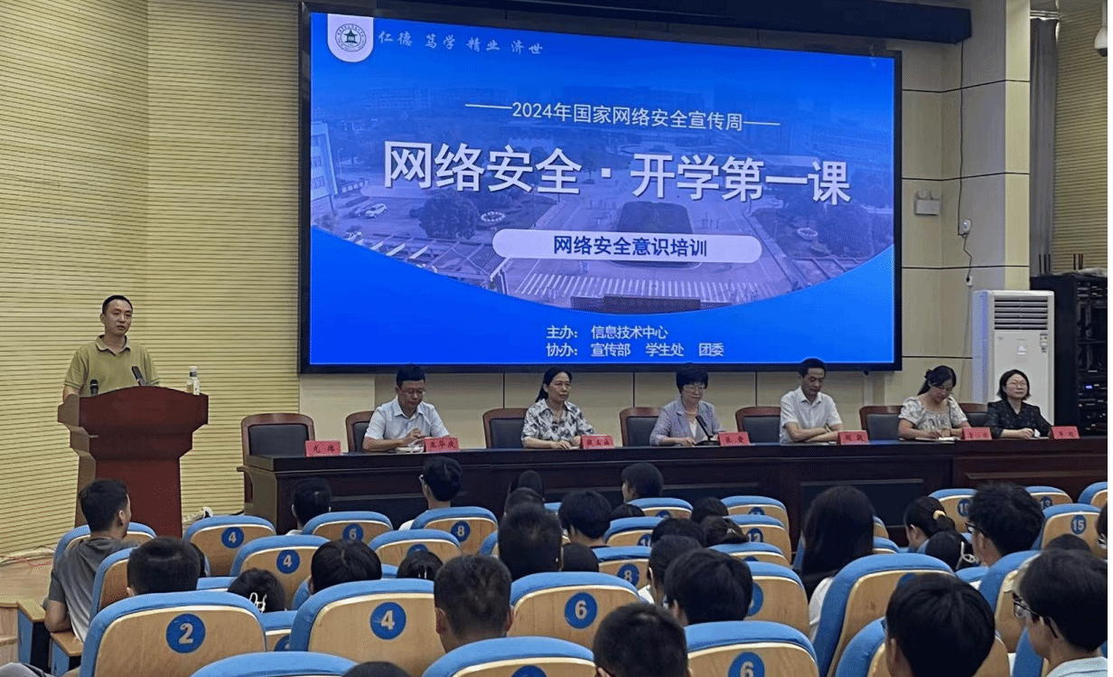 为深入学习宣传贯彻习近平总书记关于教育强国、网络强国的重要思想,不断增强广大师生网络安全意识,9月13日中午,我校“网络安全·开学第一课”活动在校学术报告厅举行。校领导朱雯、刘毅,各学院和相关处室(中心)负责人以及24级辅导员、新生代表参加了本次活动。