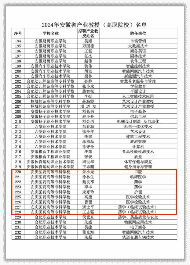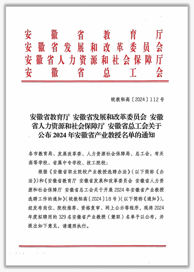 近日,经省教育厅等部门遴选、公示,我校成功推荐朱小龙等9人入选安徽省产业教授,推荐汪瑞等6人入选2024年高校中青年教师培养行动项目。