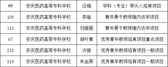 为大力实施人才兴皖工程,落实4.0版安徽人才政策,加快推进我校教师队伍建设,根据省委省政府关于加强人才工作和高校教师队伍建设的部署要求,我校积极组织高校中青年教师培养行动项目的推荐工作,经个人申报、校级评审推荐、省级审核遴选等程序,我校汪瑞同志入选学科(专业)带头人培育项目,刘媛媛、李瑜两名同志入选青年骨干教师境内访学研修资助项目,胡叶青同志入选优秀青年教师培育项目重点项目,朱金燕、许娟两位同志入选优秀青年教师培育项目一般项目。