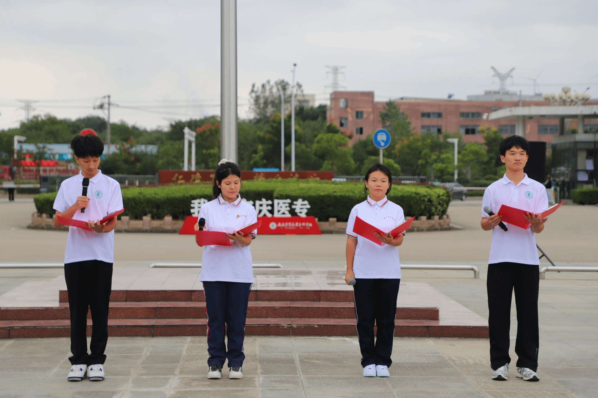 升旗仪式上,中职班学生代表和专科班学生代表以《盛世中华》为题做国旗下的演讲。仪式最后,全场合唱《我和我的祖国》为祖国母亲献上最真挚的生日祝福。