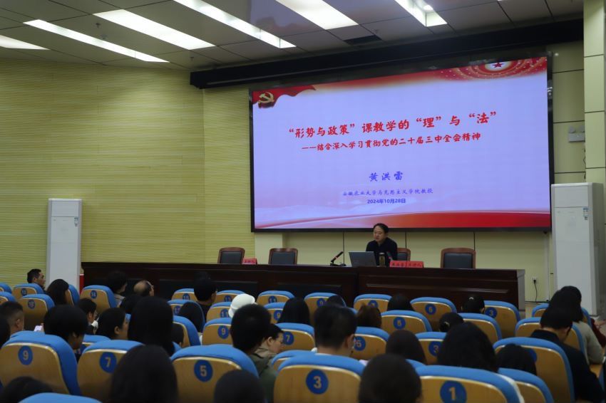 10月28日,在全校上下掀起学习习近平总书记在安徽考察时的重要讲话精神的热潮之际,安徽农业大学党委委员、马克思主义学院教授黄洪雷应邀来到我校,以“形势与政策”课教学的“理”与“法”——结合深入学习贯彻党的二十届三中全会精神为题,为全校师生作专题报告。校党委副书记张仕庆,校党委委员、药学院党总支书记、院长刘毅出席,部分党务干部、专职思政课教师、学生思政委员、青马班学员近200人聆听报告。专题报告会由校党委委员、宣传部部长朱雯主持。