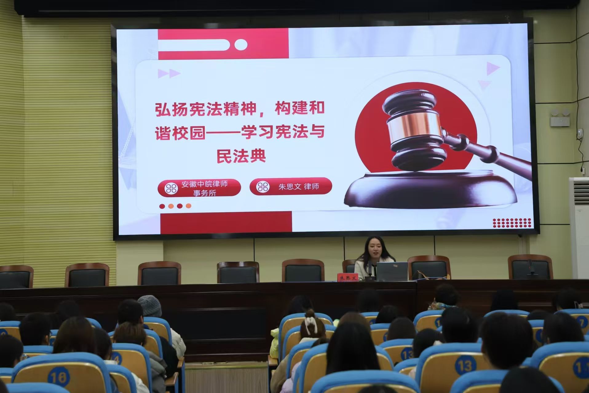 为深入学习贯彻习近平法治思想,大力弘扬宪法和社会主义法治精神,增强我校师生的宪法意识与法治观念,2024年12月10日,我校在图书馆学术报告厅举办普法讲座。此次讲座特别邀请了安徽中皖律师事务所朱思文律师,以“弘扬宪法精神,构建和谐校园”为主题,为师生带来了一场法律知识的盛宴。