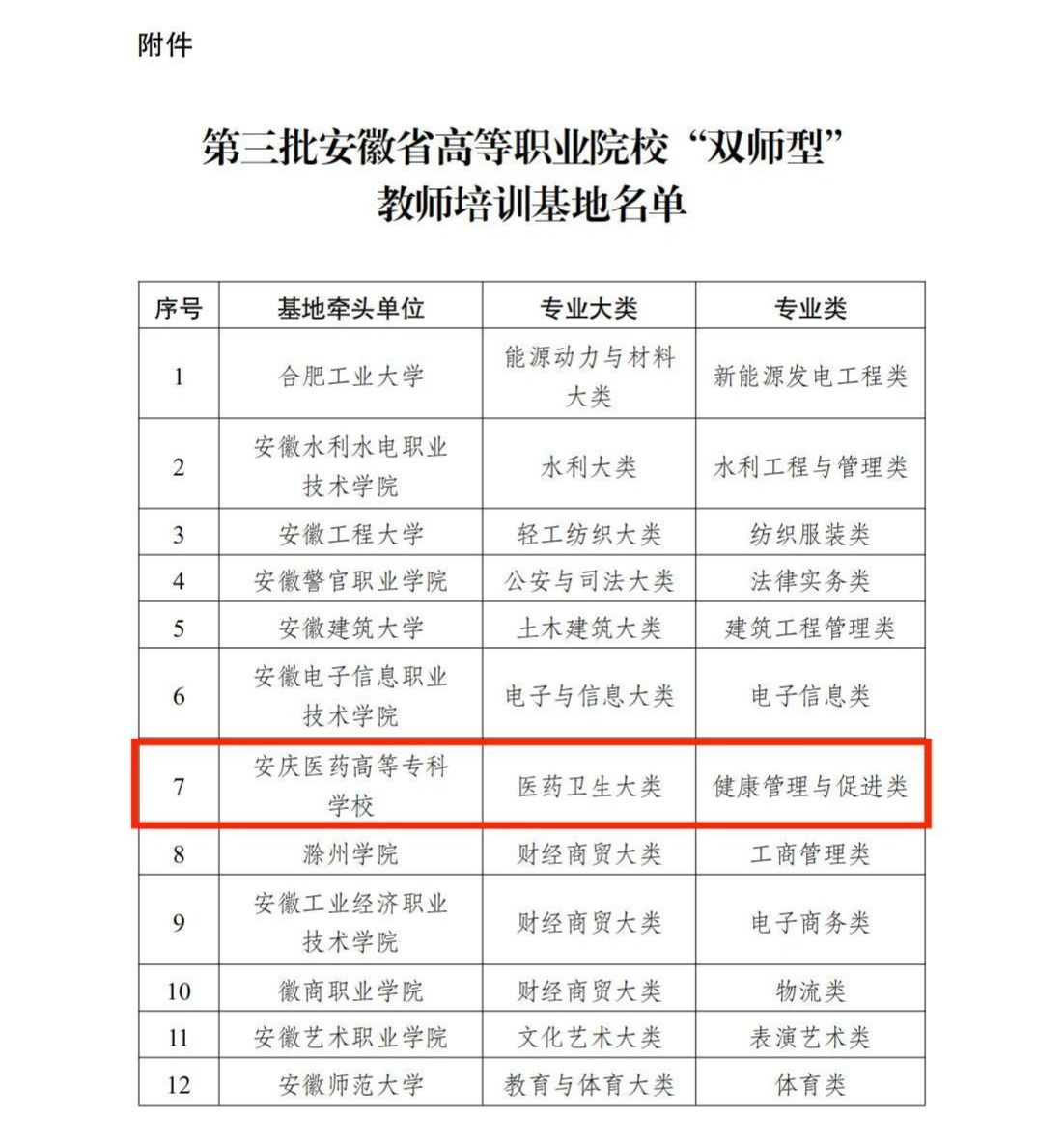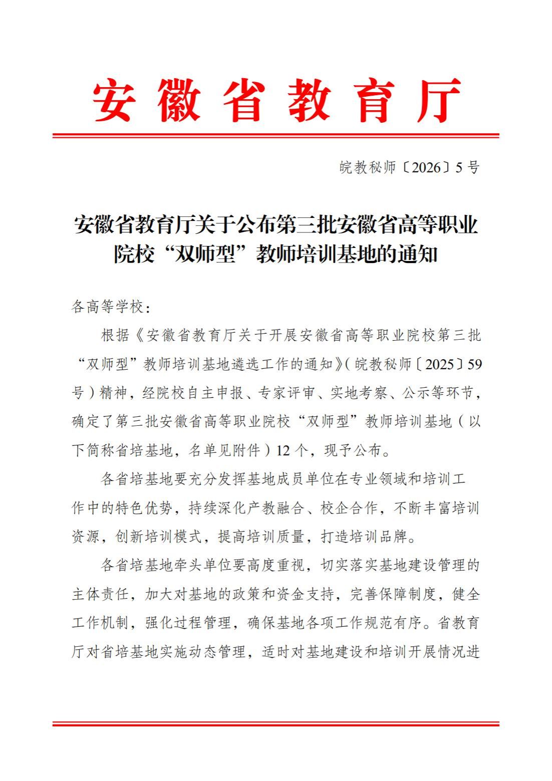 近日,安徽省教育厅印发了《关于公布第三批安徽省高等职业院校“双师型”教师培训基地的通知》(皖教秘师〔2026〕5号)。经自主申报、专家评审、实地考察、公示等环节,365beat版app在全省普通本科院校及职业院校中脱颖而出,成功获批安徽省高等职业院校“双师型”教师培训基地(健康管理与促进类),系本批次全省唯一获得“医药卫生大类”专业培训资质的高职院校。该成果标志着学校在推动职业教育高质量发展进程中取得的又一突破。