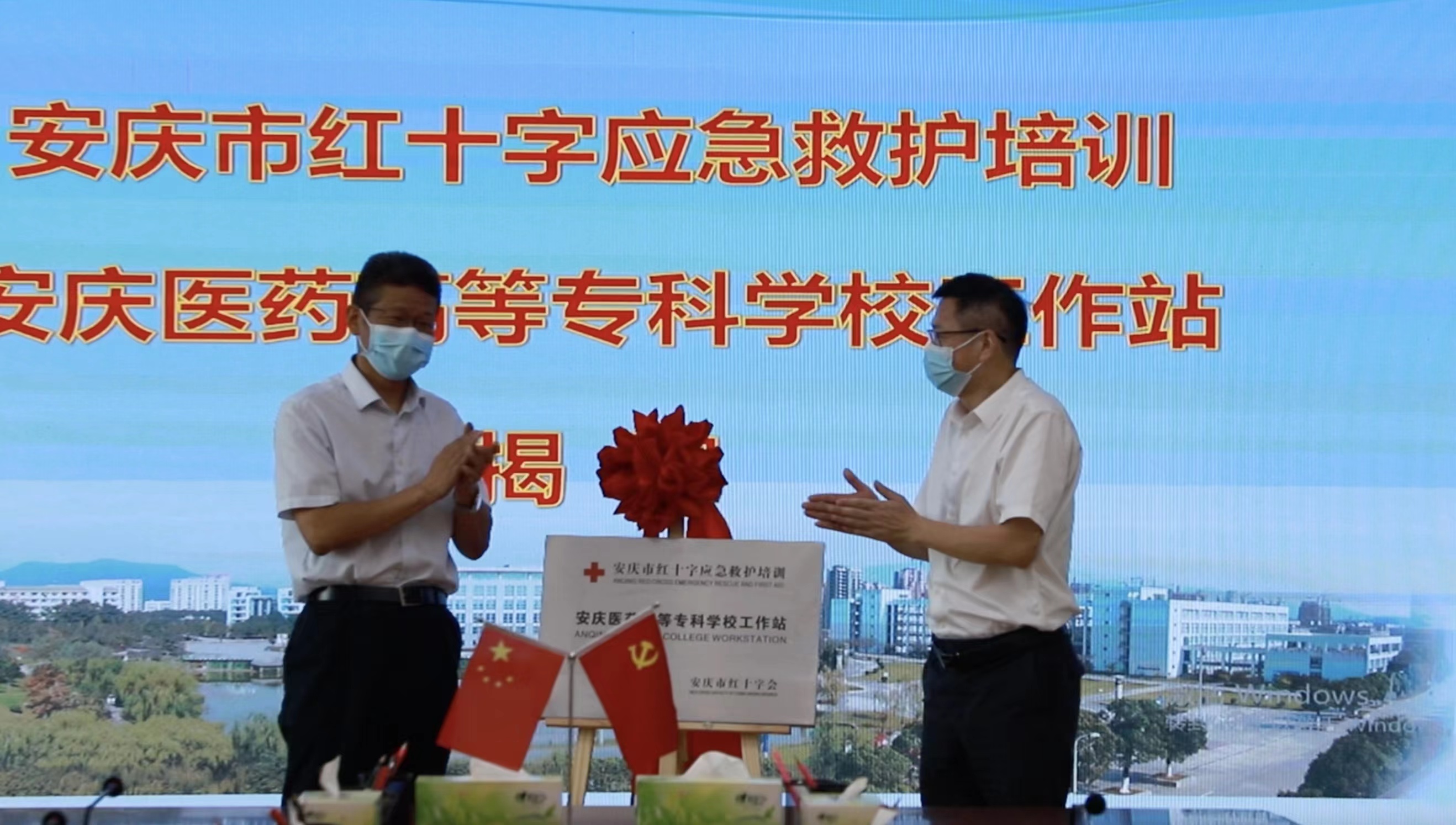 9月7日上午, 我校举行安庆市红十字应急救护365beat版app工作站揭牌仪式。安庆市红十字会党组书记、专职副会长陈滨,校党委副书记、校长姚文兵共同为工作站揭牌。仪式由党委委员、办公室主任朱雯主持。