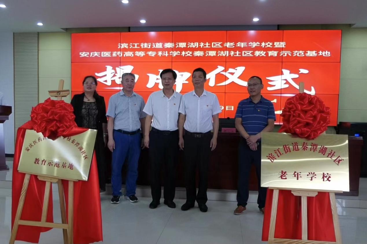 9月9日上午,我校社区教育示范基地揭牌仪式在迎江区秦潭湖社区举行。学校副校长毛以成,迎江区区委常委、组织部长、统战部长陶小也出席活动。我校继续教育学院工作人员,滨江街道办事处主要领导,秦潭湖社区工作人员、基地学员等参加。