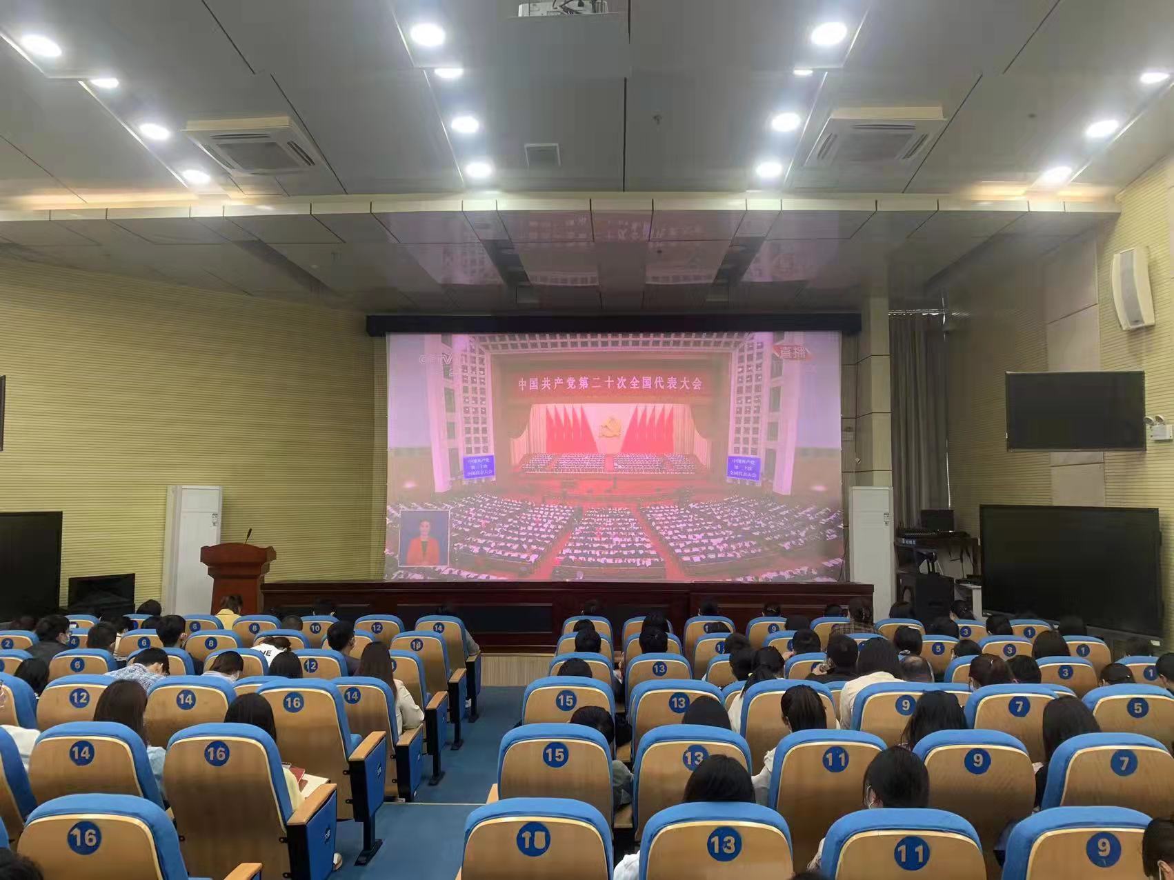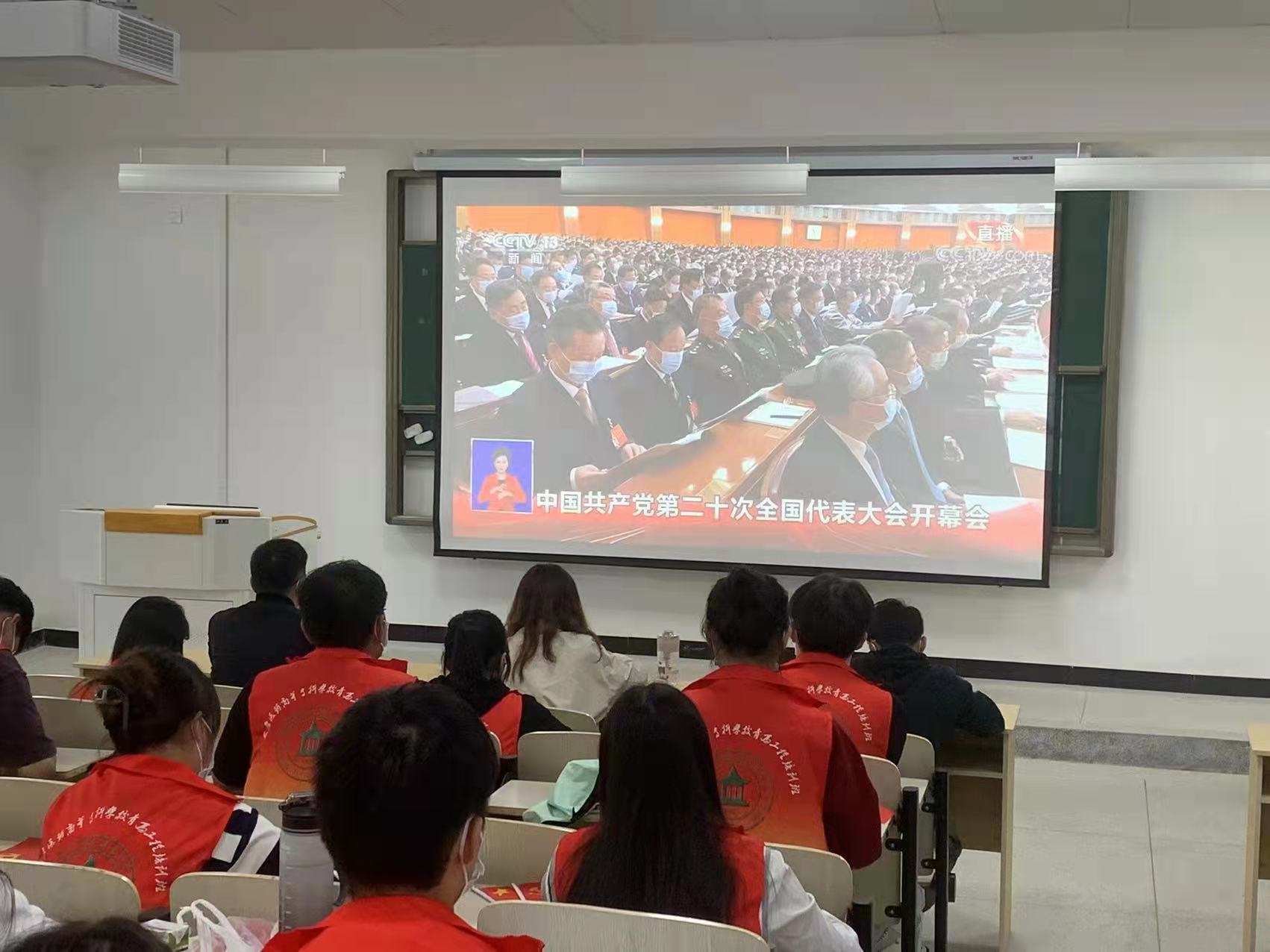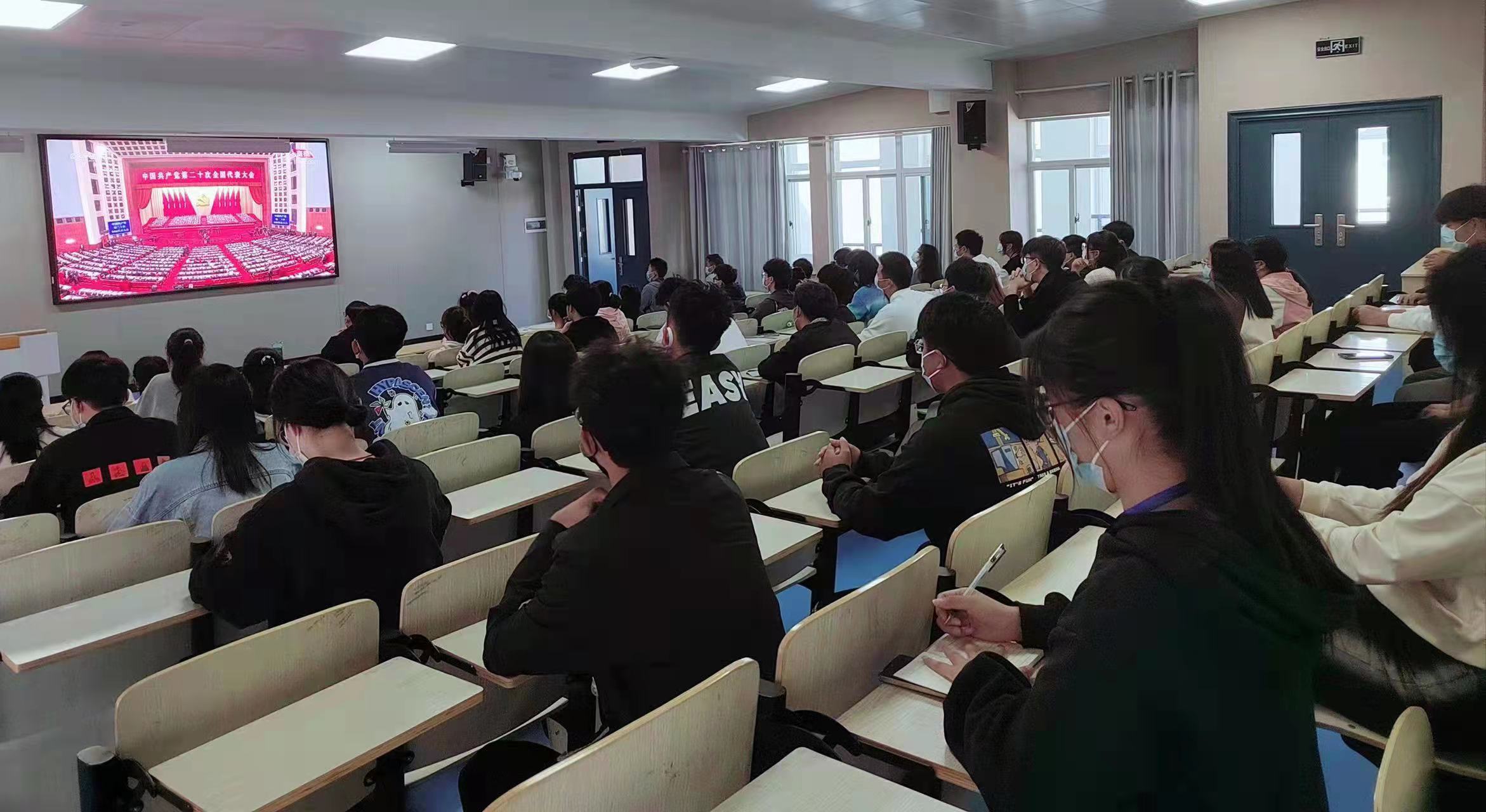 党的二十大是在全党全国各族人民迈上全面建设社会主义现代化国家新征程、向第二个百年奋斗目标进军的关键时刻召开的一次十分重要的大会,是全党全国各族人民政治生活中的一件大事。在观看直播现场,广大师生边看边做好记录,不时以热烈的掌声回应大会精彩报告。