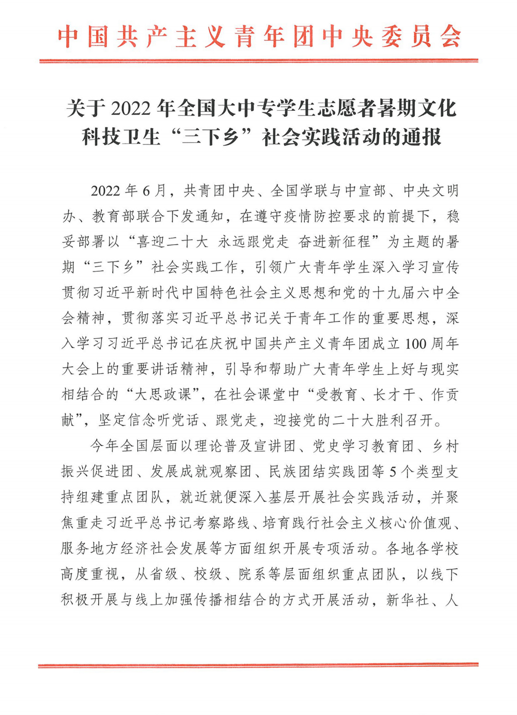 为贯彻落实习近平总书记在庆祝中国共产主义青年团成立100周年大会上的重要讲话精神,引导广大青年学生在社会实践中“受教育、长才干、作贡献”,上好与现实结合的大思政课,我校2022年暑期组织开展以“喜迎二十大、永远跟党走、奋进新时代”为主题的“三下乡”社会实践活动。经团队项目申报、校级项目审批,共立项5支校级重点团队,共计422余名师生开展团队实践活动。1200多名学生以返家乡形式参与当地疫情防控、医疗卫生、社会调研等各种形式的个人实践活动。