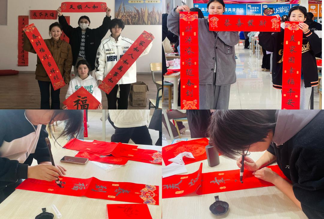“写春联、送福字”是我们最喜闻乐见的传统节庆习俗之一,其中蕴含着丰厚的中华传统文化之美。学生们挥毫泼墨,一同写春联、写福字,将学习、生活场所装扮的红火、喜气。除夕夜,中职班派驻老师和同学们早早来到阶梯教室一起观看兔年春晚,同学们感受到了浓浓的中国年氛围。