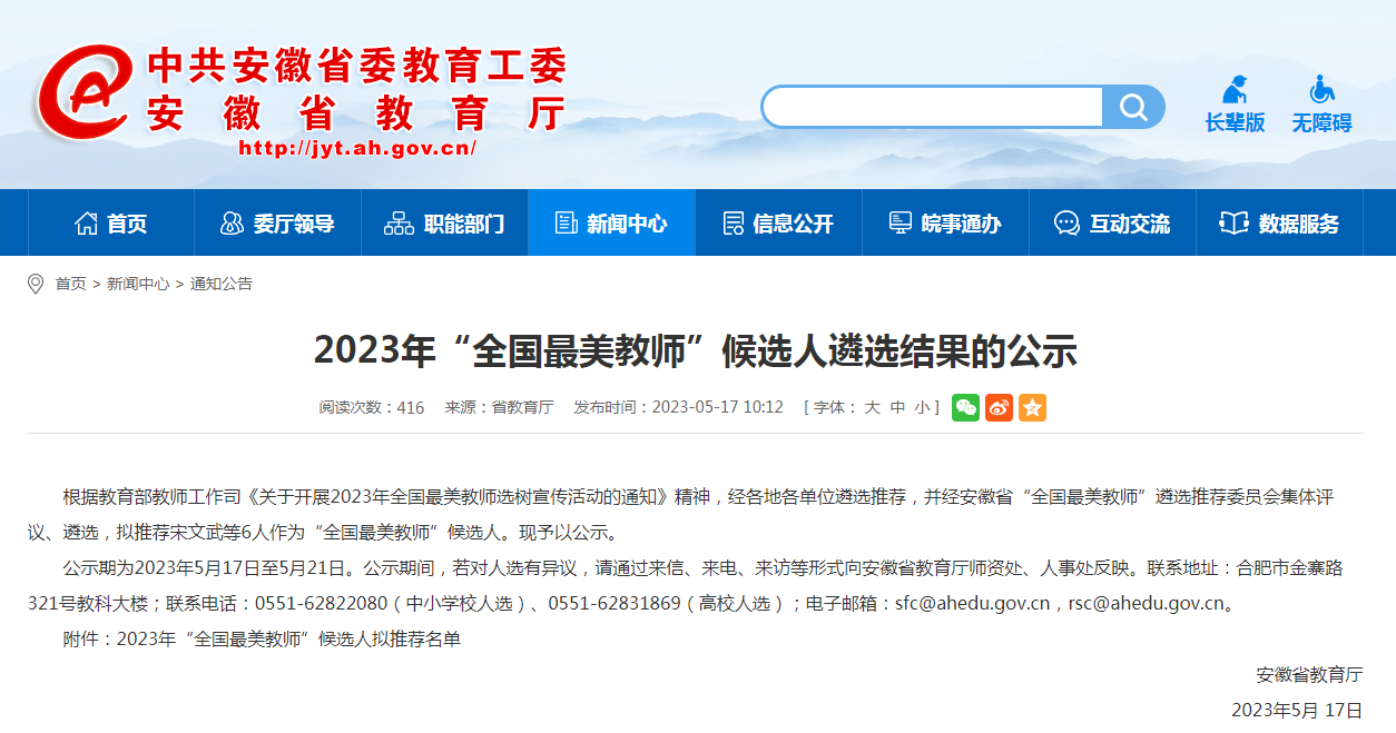 5月17日,安徽省教育厅网站公示2023年“全国最美教师”候选人遴选结果,我校教师吴江玲入选。