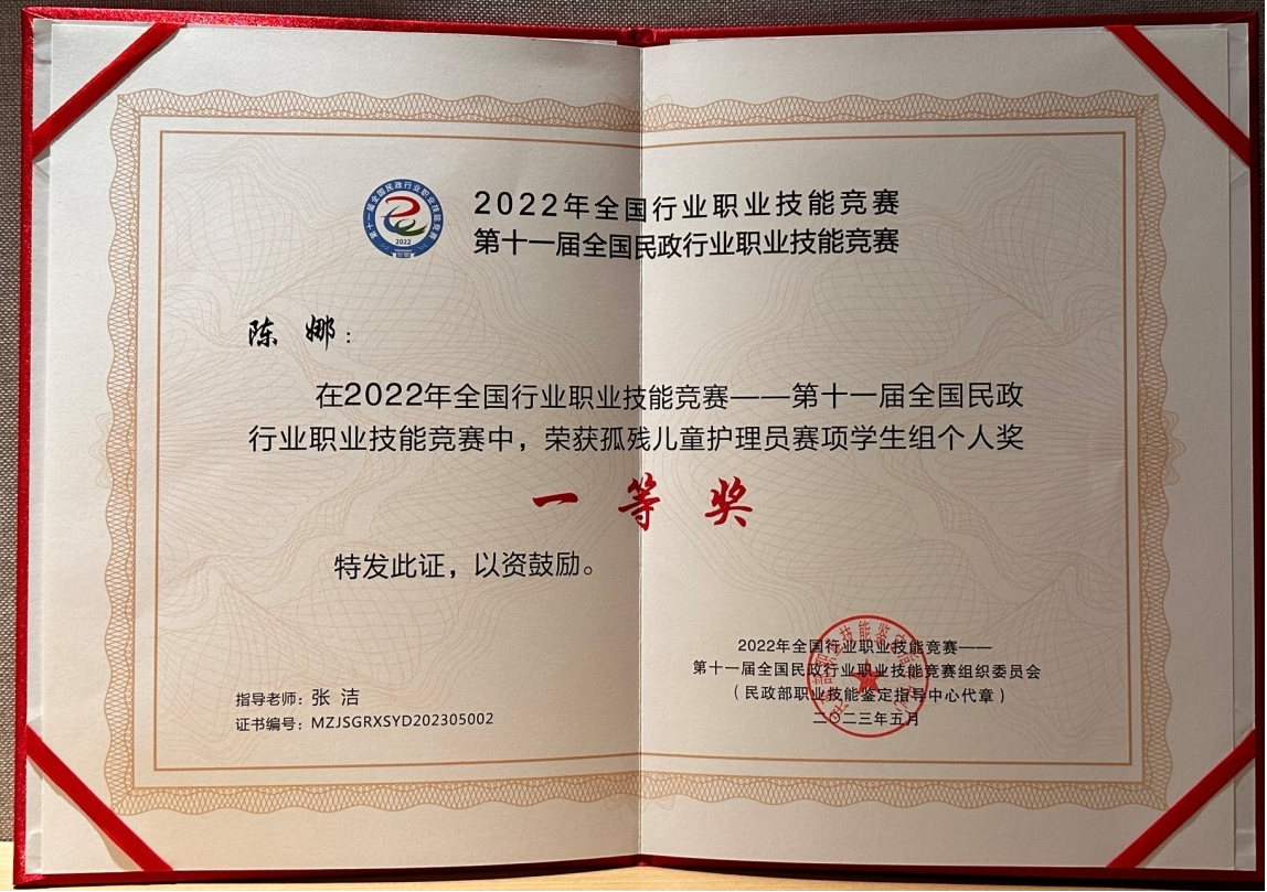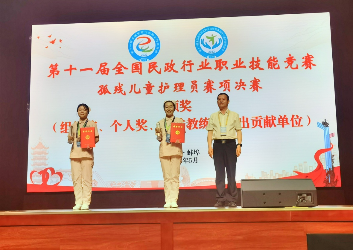 2023年5月24-25日,第十一届全国民政行业职业技能竞赛(孤残儿童护理员赛项)决赛在安徽省蚌埠市举行。来自全国的29支参赛队,78名选手(职工组58名、学生组20名)经过激烈角逐,我校护理学院陈娜同学荣获学生组一等奖,张洁老师荣获优秀教练称号。