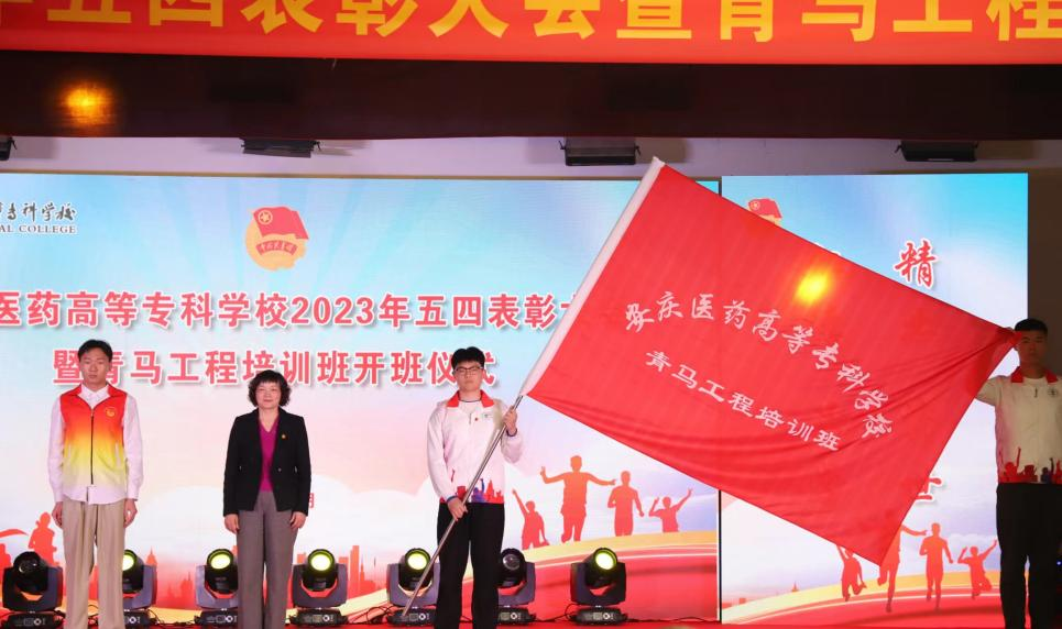 校党委书记叶林霞在开班仪式上为2023年校青马工程培训班学员授旗