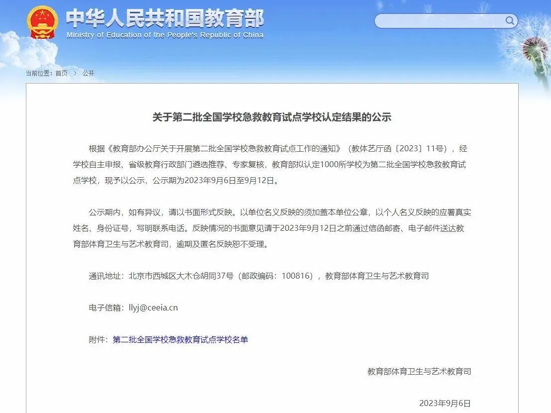 9月6日,教育部办公厅发布公示,拟认定1000所学校为第二批全国学校急救教育试点学校,我校成功入选。