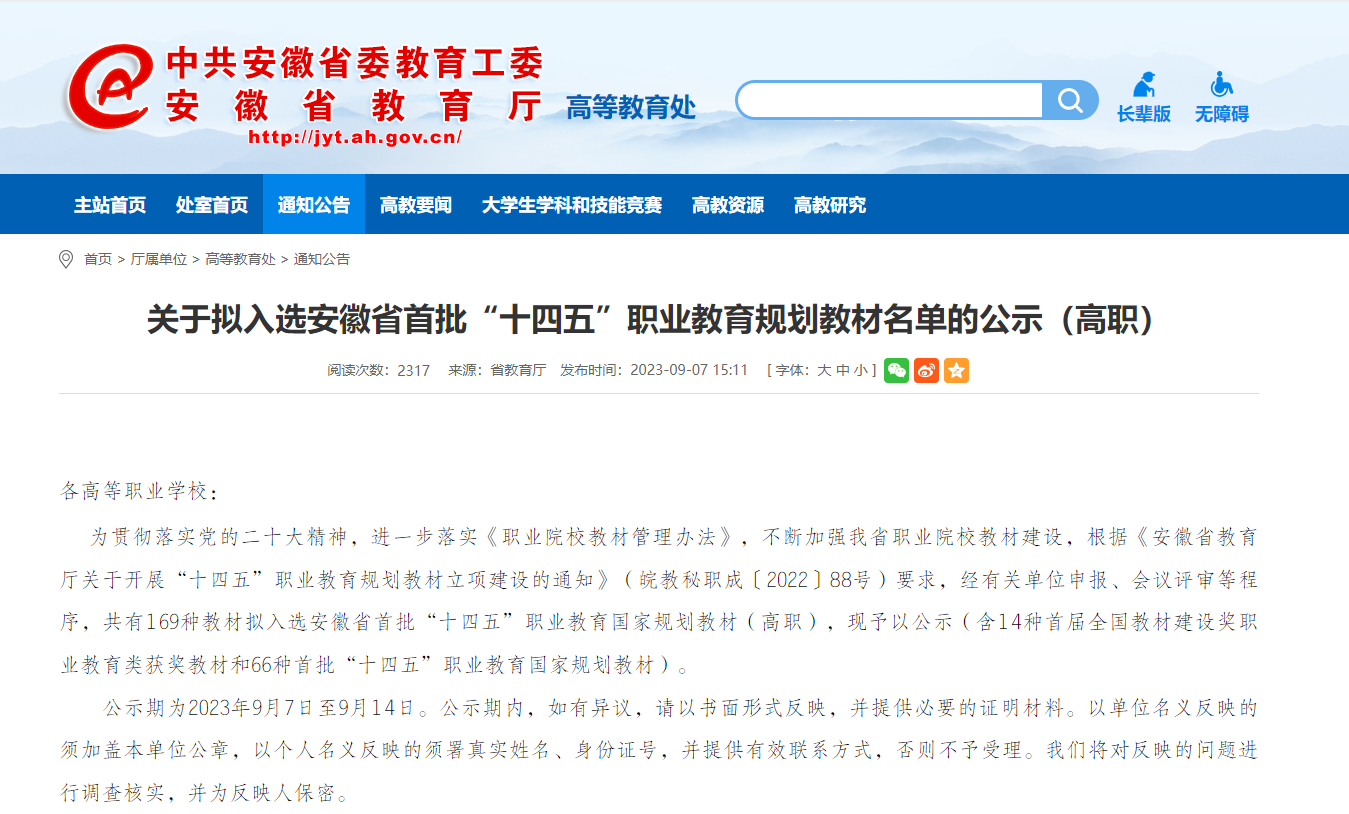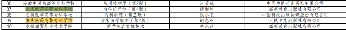 2023年9月7日,安徽省教育厅发布《关于拟入选安徽省首批“十四五”职业教育规划教材名单的公示(高职)》,我校《预防医学(第二版)》《内科护理学(第四版)》《临床医学概要(第二版)》等三本教材入选省十四五规划教材,其中《预防医学(第二版)》获得首届国家教材建设奖。