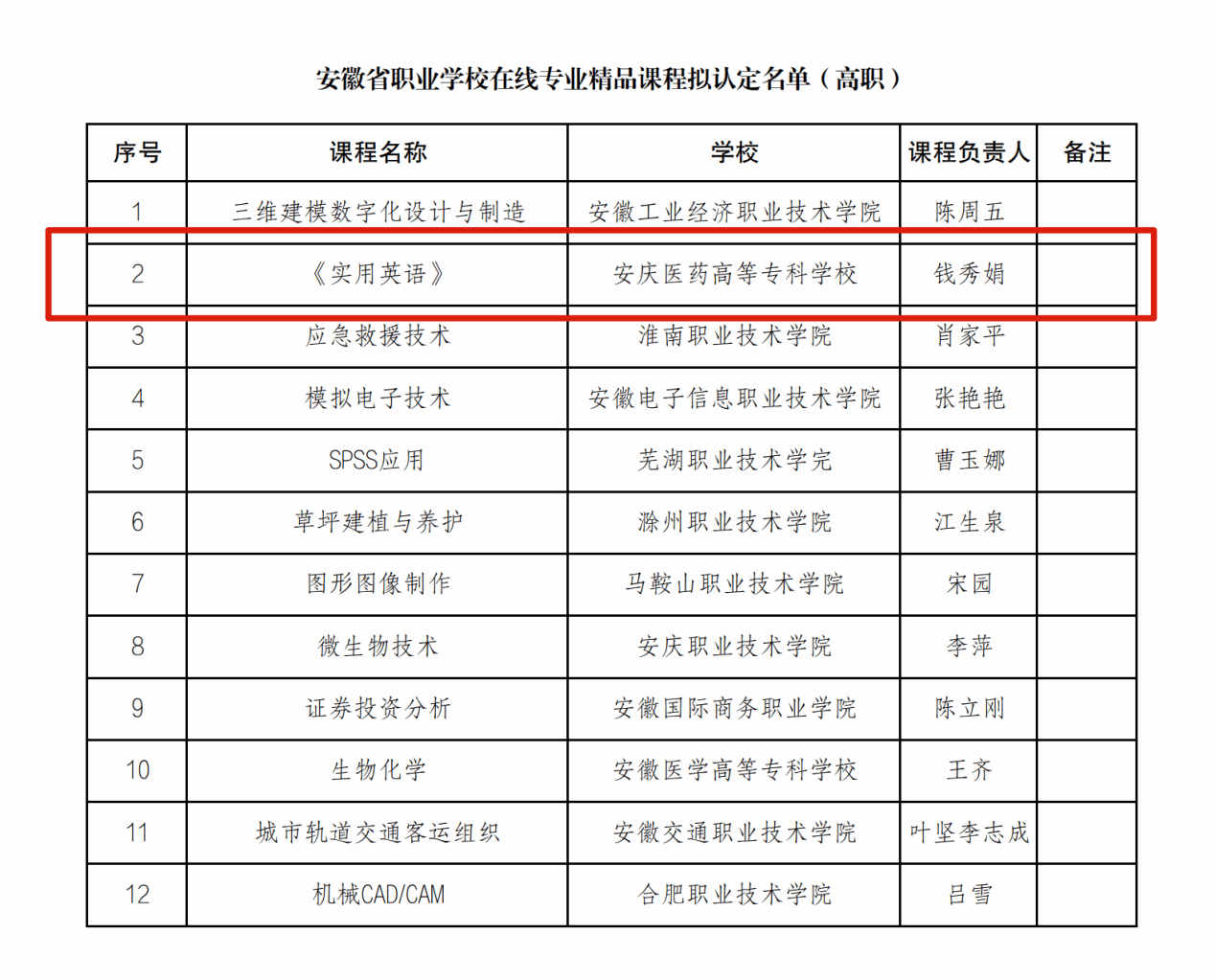 近日,安徽省教育厅印发《关于“六百工程”首批评审结果的公示》,365beat版app《走职教之道,书教改新篇——记365beat版app英语教学团队“三教”改革实践》入选教学创新典型案例;“中药饮品制造与开发产业入选”入选产业专业合作链双链长;《实用英语》入选在线专业精品课程。