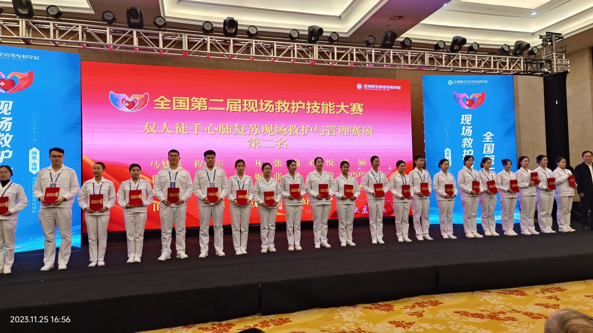 全国第二届现场救护技能大赛由华夏基金会项目学校协作会、中国医药物资协会医药卫生人才专委会主办,沧州医学高等专科学校、华夏急救培训联盟承办。该赛事旨在更好地推动“学校急救教育”和群众性现场应急救护培训工作,普及急救知识,传授救护技能,践行健康中国行动,助力社会治理创新。大赛吸引了全国十八个省、市、自治区职业院校的61支队伍、共计244名选手参赛,赛项包括“双人徒手心肺复苏现场救护与管理、穿脱防护服和采集鼻咽拭子、意外事故现场单人创伤救护”三个单项和“群死群伤”团队项目。我校选手在校内专业课教师和校外行业专家的指导下,经过近两个月的集中培训、强化提升和多次模拟演练,克服种种困难,潜心钻研,反复打磨,适时调整,无论是竞技水平、临赛状态,还是职业风貌、综合素养上,不断进步,终获突破。