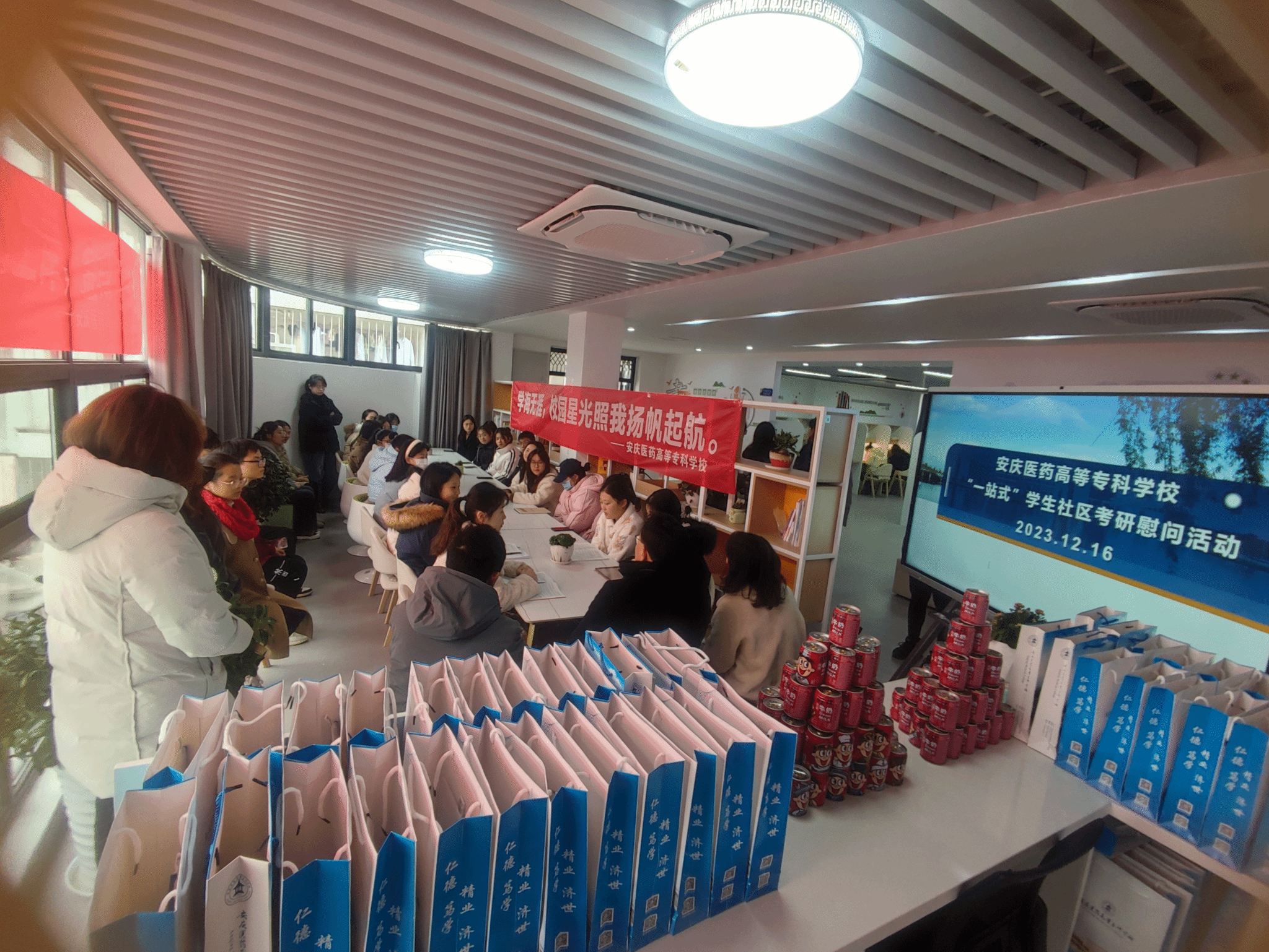 为深入了解考研学生备考情况,帮助考研学生缓解压力,坚定考研信心,积极冲刺迎考。2023年12月16日上午,校党委副书记、校长朱庆丰,党委委员陈琪、刘毅,教务处、学生处、医学院主要负责人及各学院学管工作人员一行,来到“悦享空间”一站式学生社区开展考研暖心慰问活动。