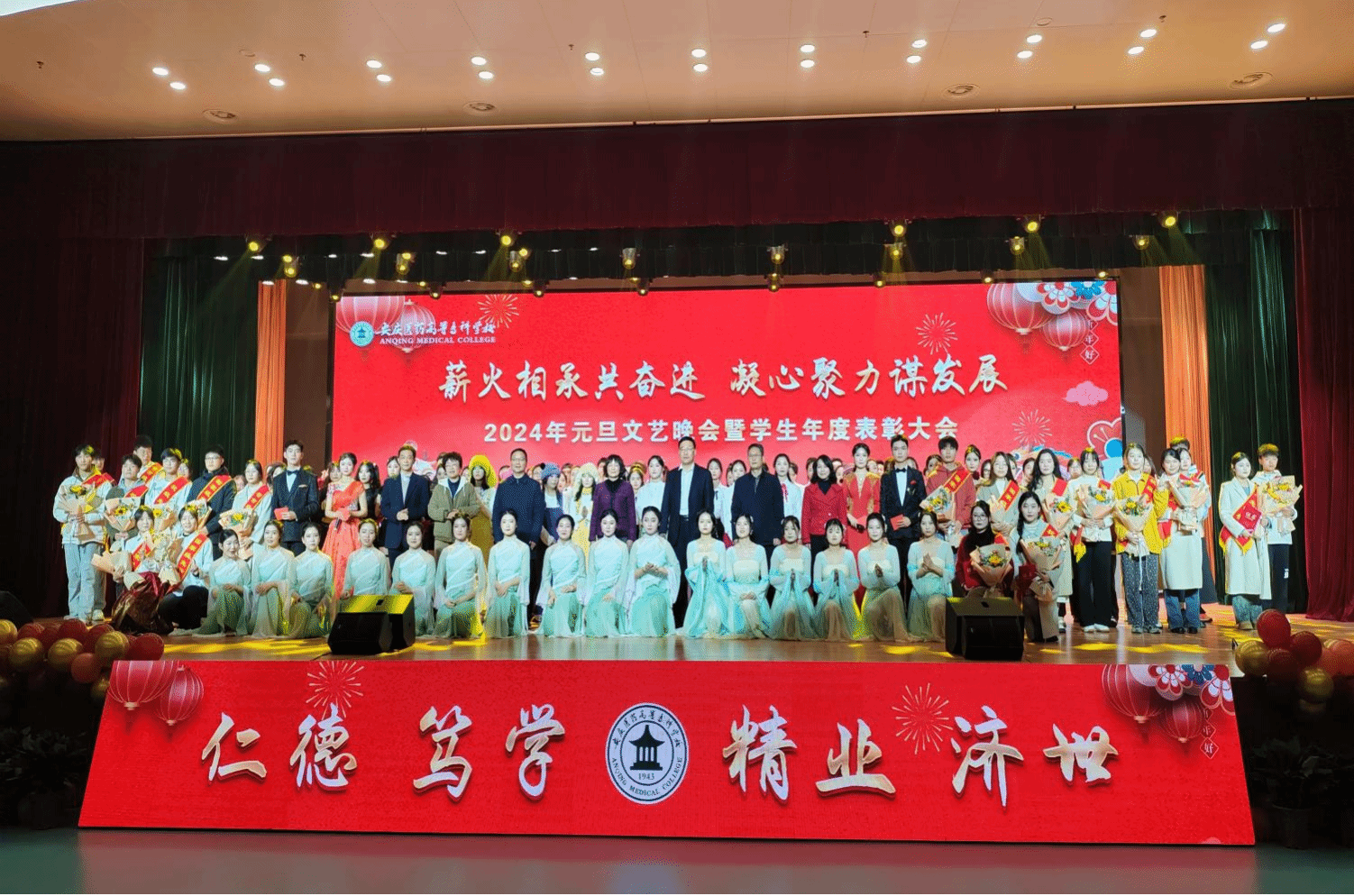 薪火相承共奋进,凝心聚力谋发展。12月29日晚,校2024年元旦文艺晚会暨学生年度表彰大会在大学生活动中心隆重举行,校领导叶林霞、朱庆丰、张仕庆、陈燚、朱雯、陈琪、刘毅与700余名师生代表欢聚一堂,表彰先进、共迎新年。晚会同步通过安庆直播网、学校公众号等平台直播,吸引学校师生员工、学生家长、校友及社会各界人士近22万人线上观看。