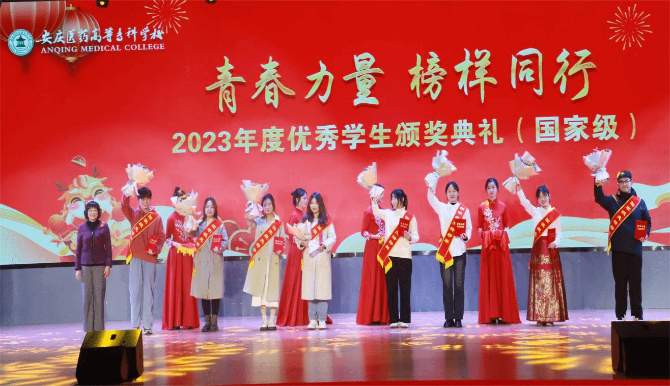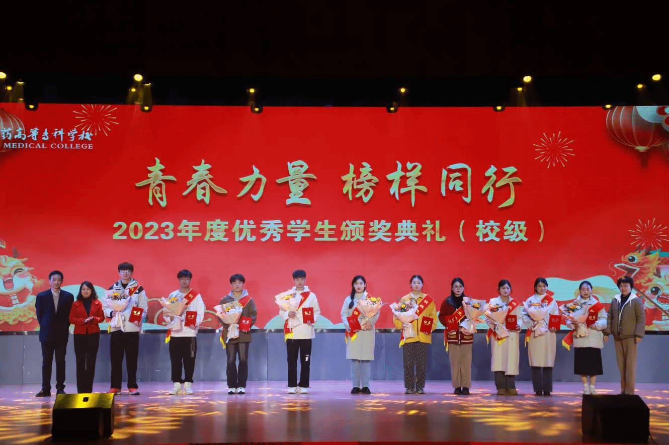 2023年,全校师生团结奋进,成果丰硕,学生荣获市级以上等各级荣誉、表彰120余项。晚会期间还举办了“青春力量,榜样同行”优秀学生颁奖典礼。党委书记叶林霞为获得全国职业院校技能大赛化学实验技术赛项一等奖、第十八届“振兴杯”全国青年职业技能大赛铜奖等国家级荣誉的学生代表颁奖,并送上鲜花。校党委副书记张仕庆,校党委委员、纪委书记陈燚为获得第九届安徽省“互联网+”大学生创新创业大赛金奖、第十届“挑战杯·华安证券”安徽省大学生课外学术科技作品竞赛一等奖等省市级荣誉的学生代表颁奖。校党委委员、宣传部部长朱雯,校党委委员、党政办主任陈琪,校党委委员、药学院党总支书记、院长刘毅为获得2023年度校园之星等各类校级荣誉的学生代表颁奖。