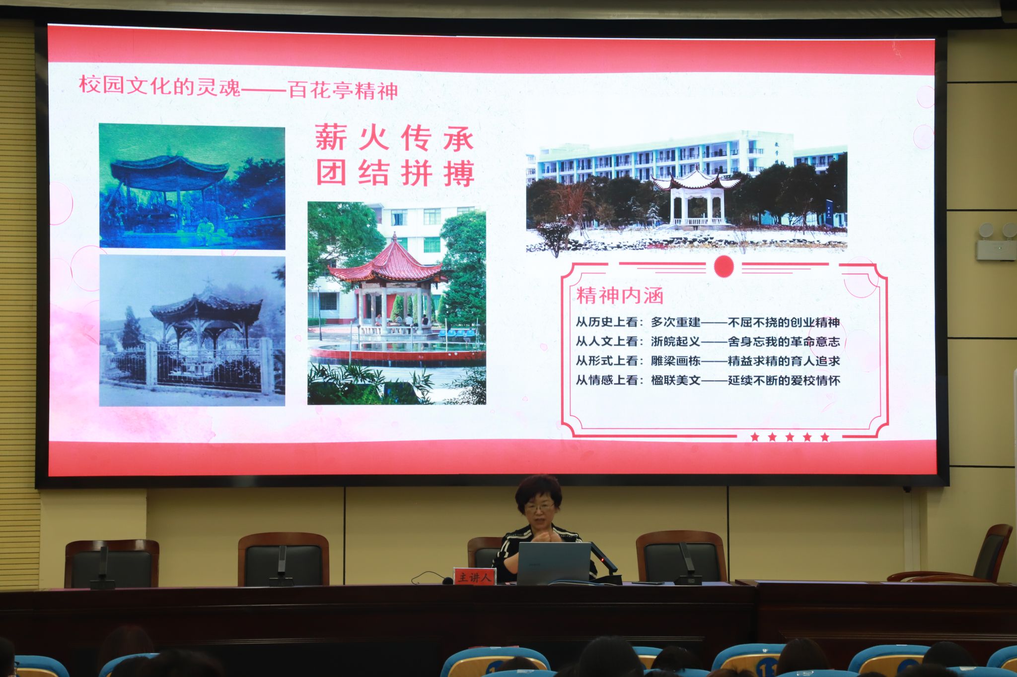 讲座现场,朱雯从充分认识提出习近平文化思想的重大意义、深入学习领会习近平文化思想的丰富内涵、以习近平文化思想为引领 加快建设繁荣兴盛的文化强市、以习近平文化思想为指引 建设具有鲜明特色的校园文化四个方面深入阐述了习近平文化思想,并紧密结合以“百花亭精神”为核心的校园文化特色、扎实推进校园文化建设,培塑校园文化自信等方面进行详细的解读。