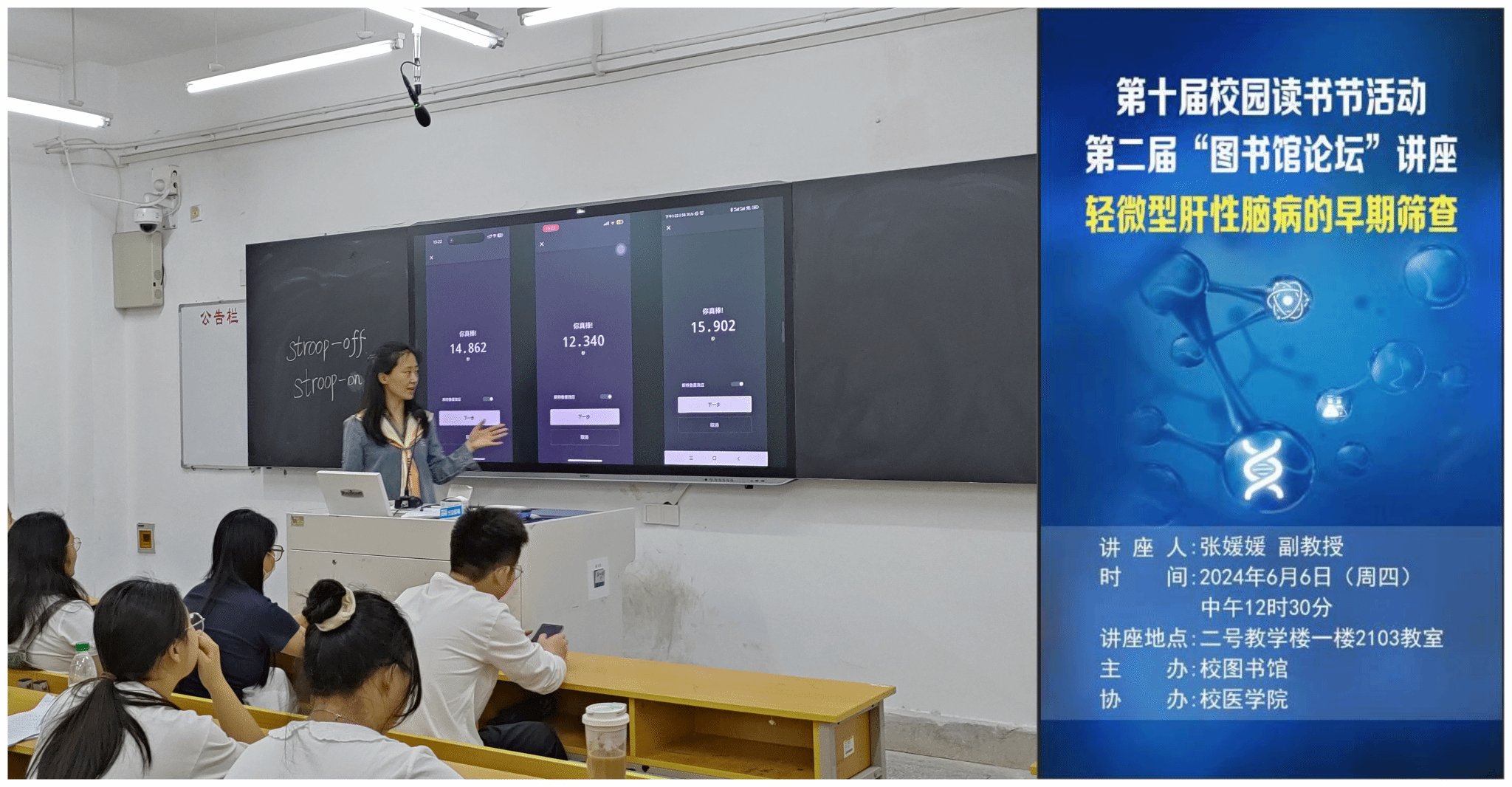 6月6日中午,医学院张媛媛副教授在2103教室举办了第二届“图书馆论坛”第六场讲座:“轻微型肝性脑病的早期筛查”,医学院130余名学生参加讲座。