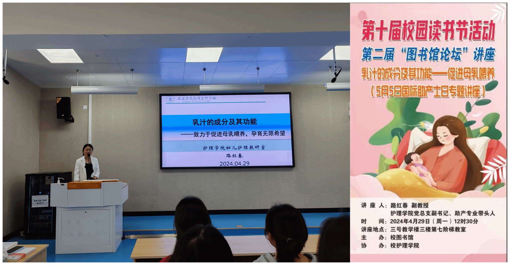 4月29日中午,护理学院党总支副书记、助产专业带头人路红春副教授在第七阶梯教室举办了第二届“图书馆论坛”第三场讲座:“乳汁的成分及其功能——致力于促进母乳喂养,孕育无限希望”,助产专业130余名同学到场聆听。