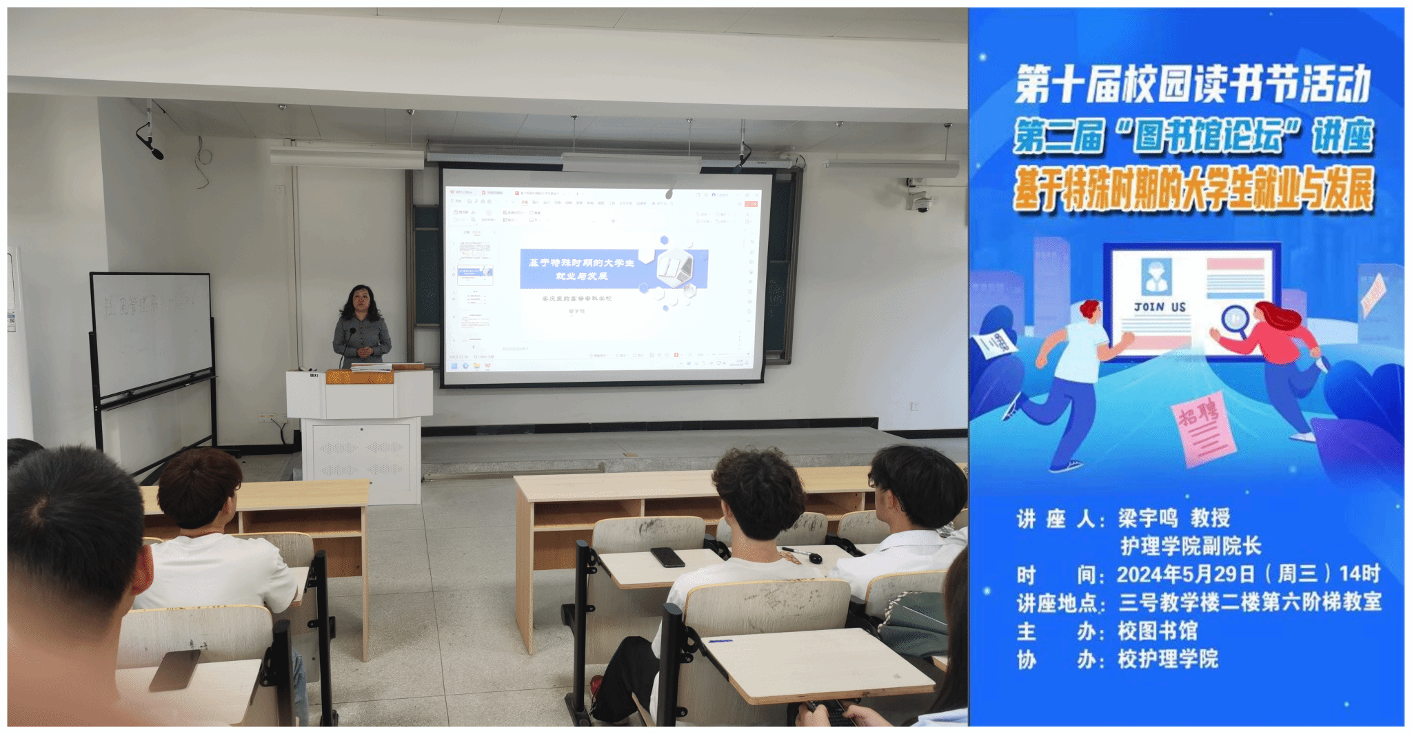 5月29日下午,护理学院副院长梁宇鸣教授在第六阶梯教室举办了第二届“图书馆论坛”第五场讲座:“基于特殊时期的大学生就业与发展”,护理学院130余名学生到场聆听。
