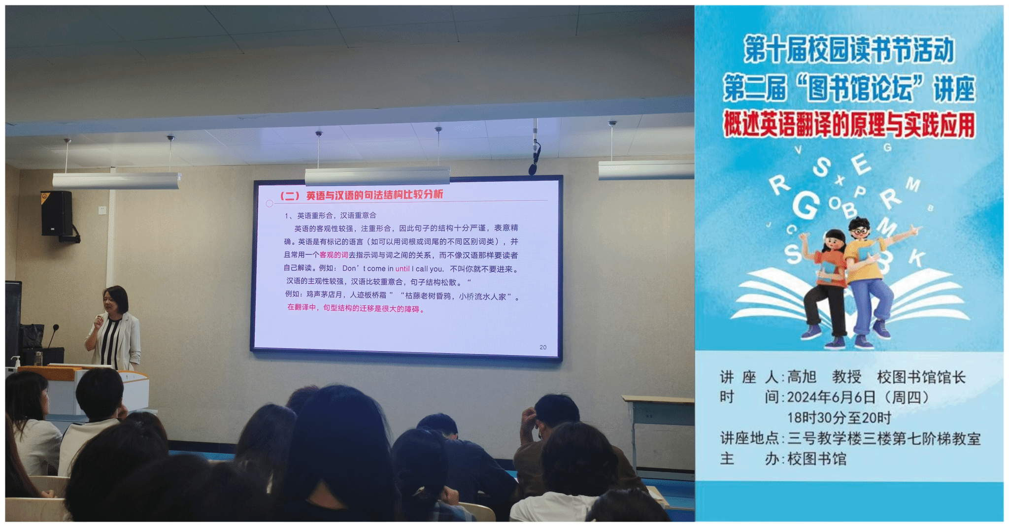 6月6日晚上6:30至8:00,图书馆馆长高旭教授在校三号教学楼第七阶梯教室举办了第二届“图书馆论坛”第七场讲座,讲座题目为:概述英语翻译的原理与实践应用。130余名学生参加讲座。