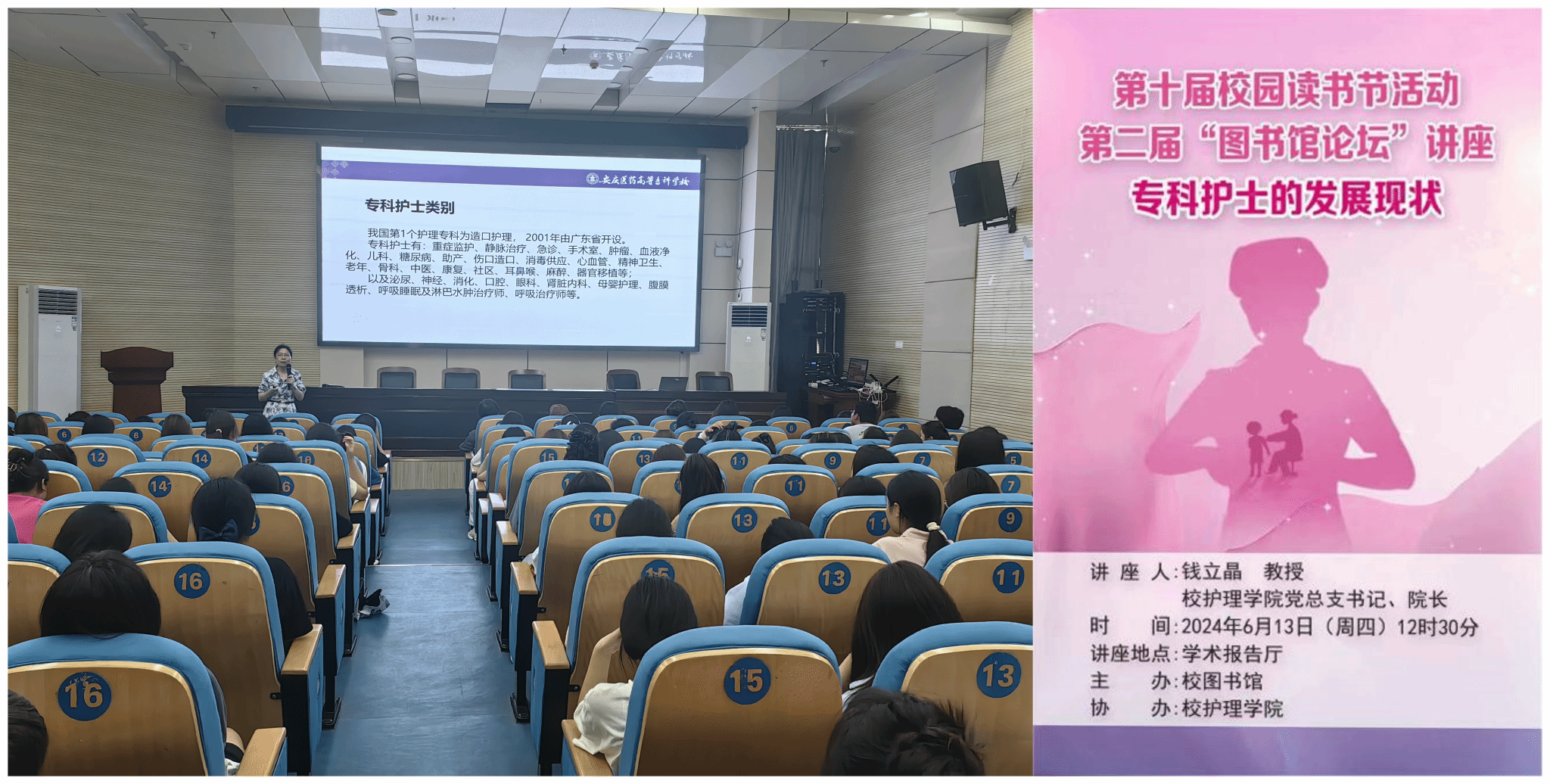 6月13日中午,护理学院党总支书记、院长钱立晶教授在校学术报告厅举办了第二届“图书馆论坛”第八场讲座,讲座题目为:专科护士的发展现状。来自护理学院的170余名学生参加讲座。