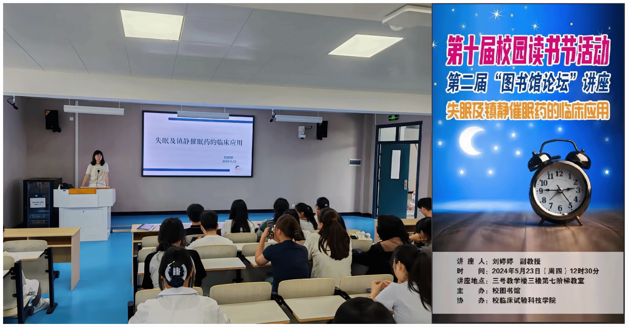 5月23日中午,临床试验科技学院刘婷婷副教授在第七阶梯教室举办了第二届“图书馆论坛”第四场讲座:“失眠及镇静催眠药的临床应用”,临床试验科技学院120余名学生到场聆听。