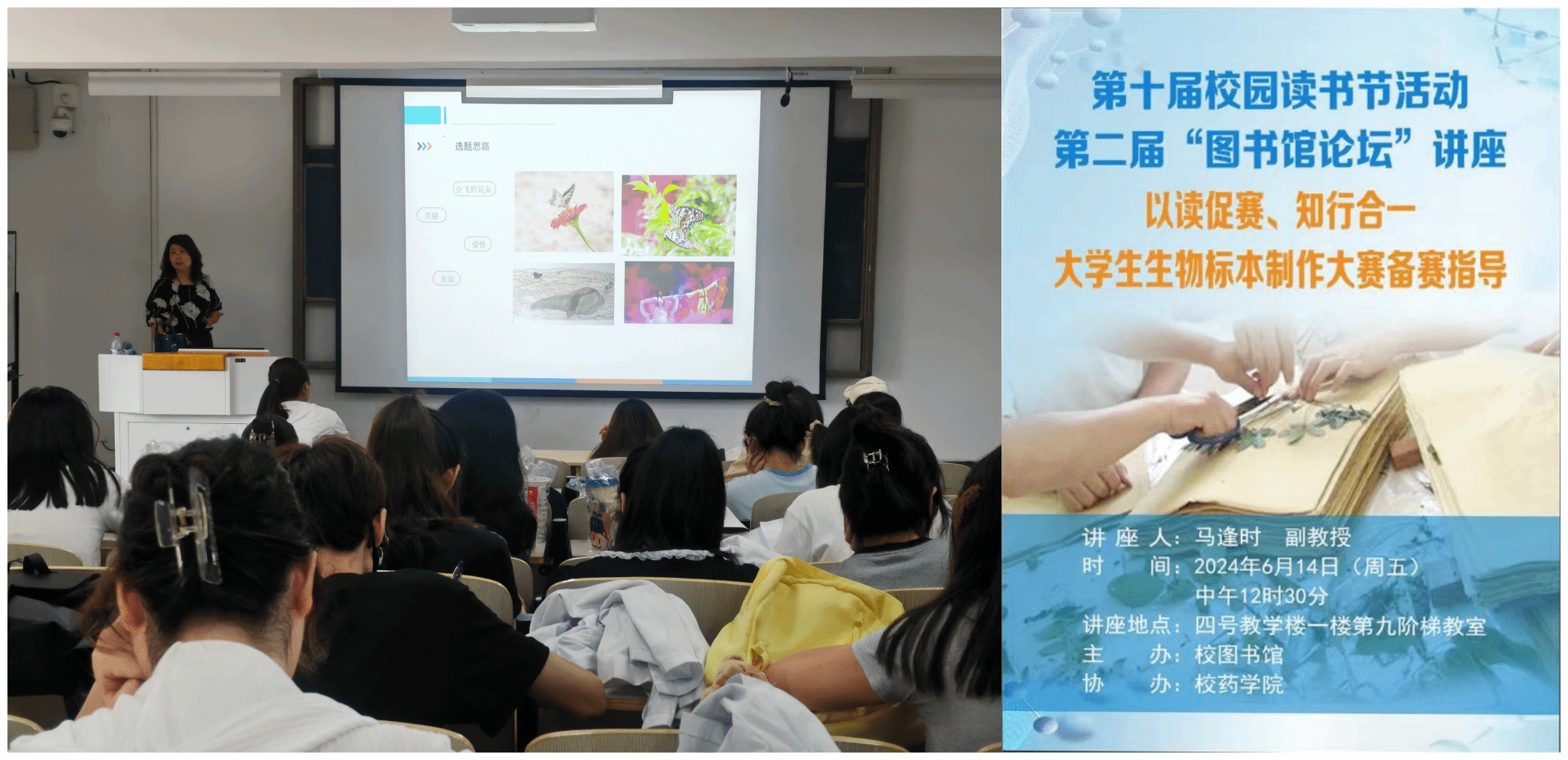 6月14日中午,药学院马逢时副教授在第九阶梯教室举办了第二届“图书馆论坛”第九场讲座,讲座题目为:以读促赛、知行合一 --大学生生物标本制作大赛备赛指导。来自药学院的130余名学生参加讲座。