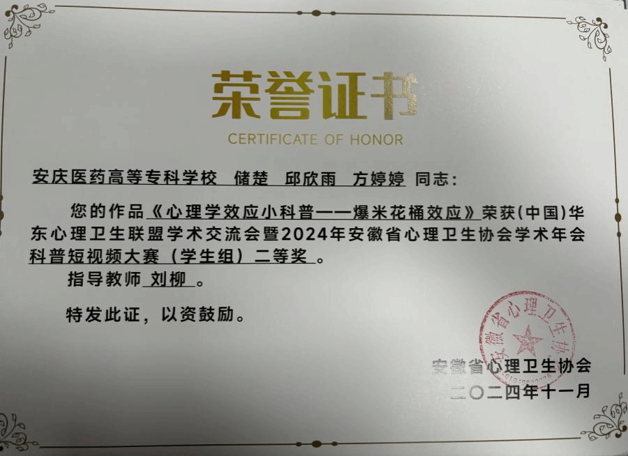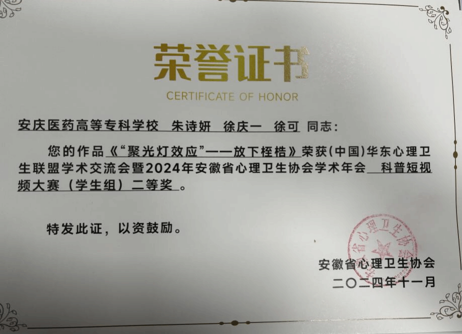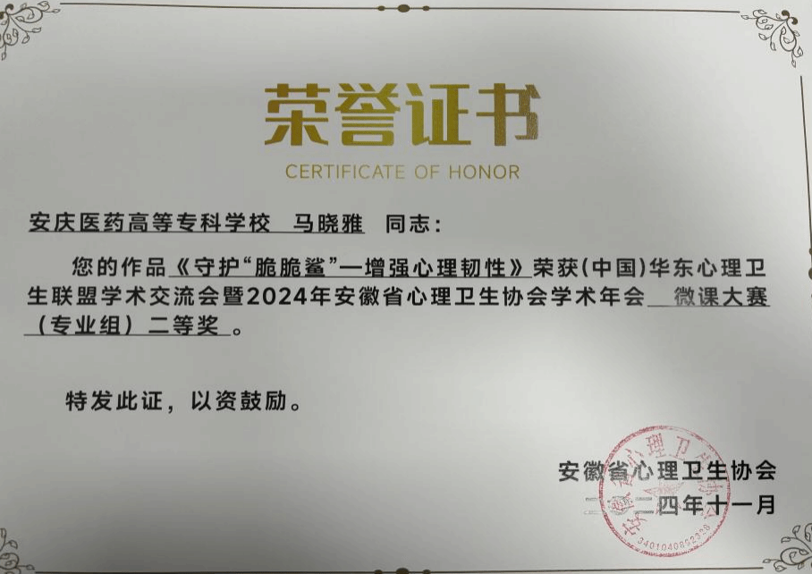 会议进行了多项的表彰仪式。我校学生处马晓雅老师的作品《守护“脆脆鲨”—增强心理韧性》荣获“微课大赛二等奖”;药学院2023级学生储楚等人的作品《心理学效应小科普—爆米花桶效应》、护理学院2023级学生朱诗妍等人的作品《“聚光灯效应”—放下桎梏》荣获二等奖;护理学院2023级学生赵晨旭等人的作品《精神上的“感冒”—认知型精神障碍》和郭宁田等人的作品《点亮黑夜中—“星星的孩子”》分别荣获三等奖。