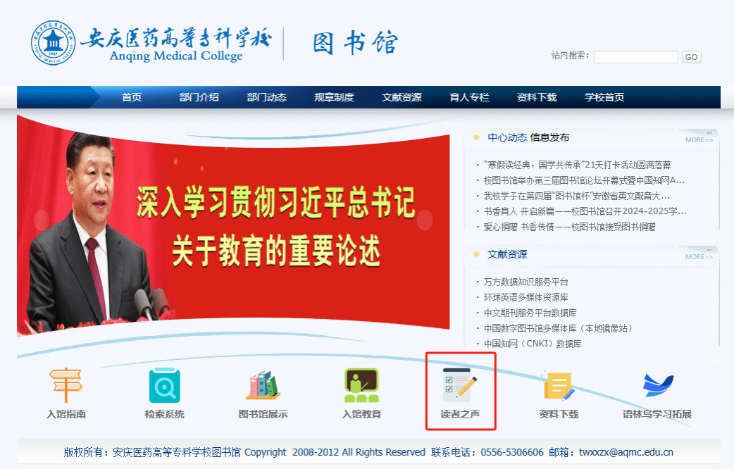 为加强校图书馆与读者之间的互动交流,图书馆官网首页新增“读者之声”专栏。馆方承诺将在48小时内对每条留言进行回复。