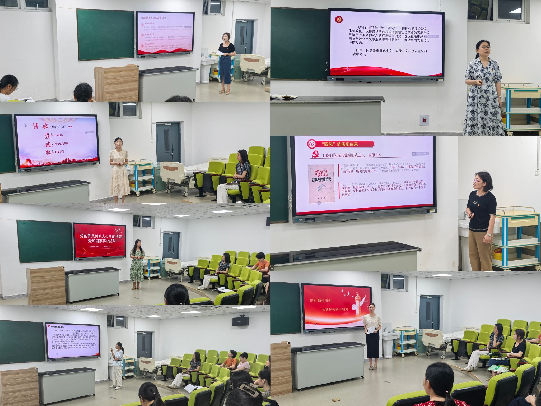随后,基层党组织书记们讲党课,共筑作风建设防线。护理学院党总支书记钱立晶、副书记以及各支部书记分别走上台前,围绕中央八项规定精神,结合岗位职责、实际工作,为党员们带来了一场场内容丰富、意义深刻的专题党课。党课中,书记们深入解读中央八项规定精神内涵,强调坚定不移纠治“四风问题”的重要性,要求全体党员锲而不舍落实中央八项规定精神,以优良作风团结广大师生,营造风清气正、积极向上的学院氛围。通过书记们的讲解,党员们对中央八项规定精神有了更深刻的认识和理解,也明确了自身在作风建设中的责任与担当。