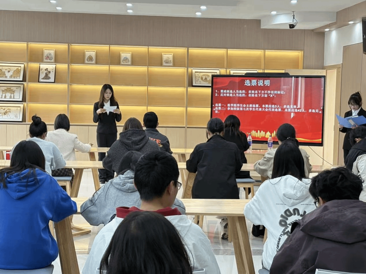 大会在雄壮激昂的国歌声中拉开帷幕。学生会代表张雅婷作工作报告,全面回顾过去一年学生会各项工作取得的成果,分析当前存在的不足,并对未来工作方向与发展目标作出展望。随后大会以无记名投票方式,选举产生医学院第十八届学生会主席团成员及第七次学生代表大会代表。
