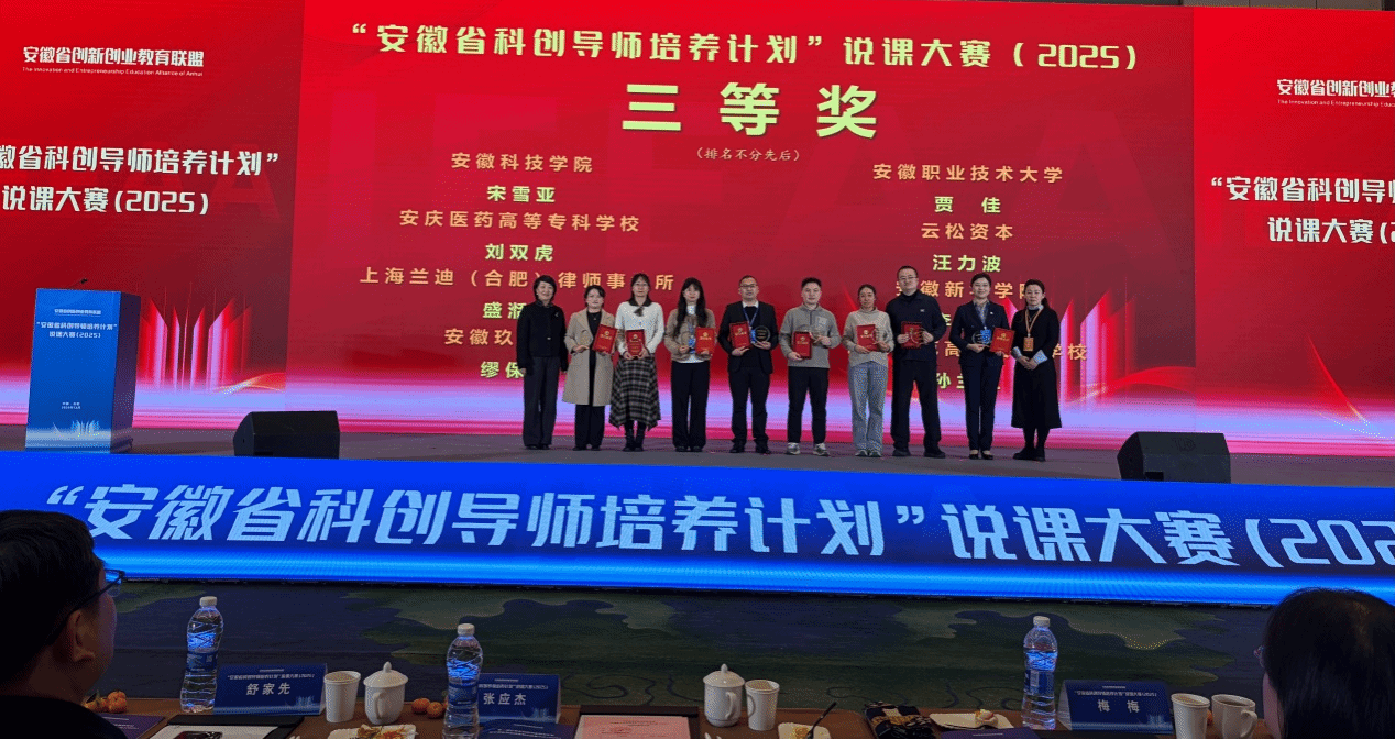 在备受关注的“安徽省科创导师培养计划”说课大赛中,经过激烈角逐,我校就业与创新创业教研室刘双虎老师表现突出,荣获大赛三等奖,充分展示了扎实的教学功底和优秀的专业素养。