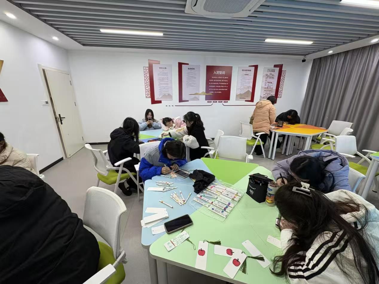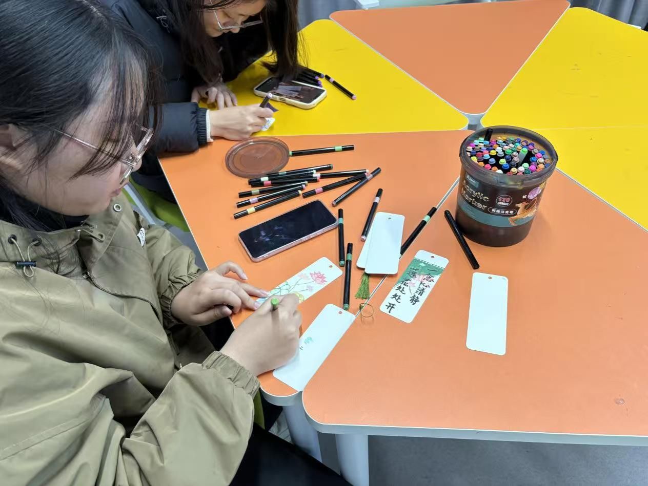 活动现场暖意融融,社团成员提前备好空白书签、彩笔、颜料等创作材料,为参与者搭建起表达廉洁心声的平台。在社团干事的引导下,大家围绕“清廉”核心主题展开创作,将廉洁内涵与社区生活巧妙融合。有的以社区标志性场景为背景,勾勒“邻里和睦、清风正气”的生活图景;有的借莲花、翠竹等象征廉洁的意象,题上“一念心清净,莲花处处开”的廉洁警句;还有的同学将社区志愿服务、垃圾分类等日常场景融入设计,诠释“廉洁就在身边”的朴素认知。社团指导老师挥笔写下廉洁警句,青年用意趣画笔描绘心中的清廉社区,现场交流创作思路的欢声笑语不断,每一张书签都承载着对社区清风正气的期盼。临近期末考试,也希望同学们可以诚信落笔,端正考风。