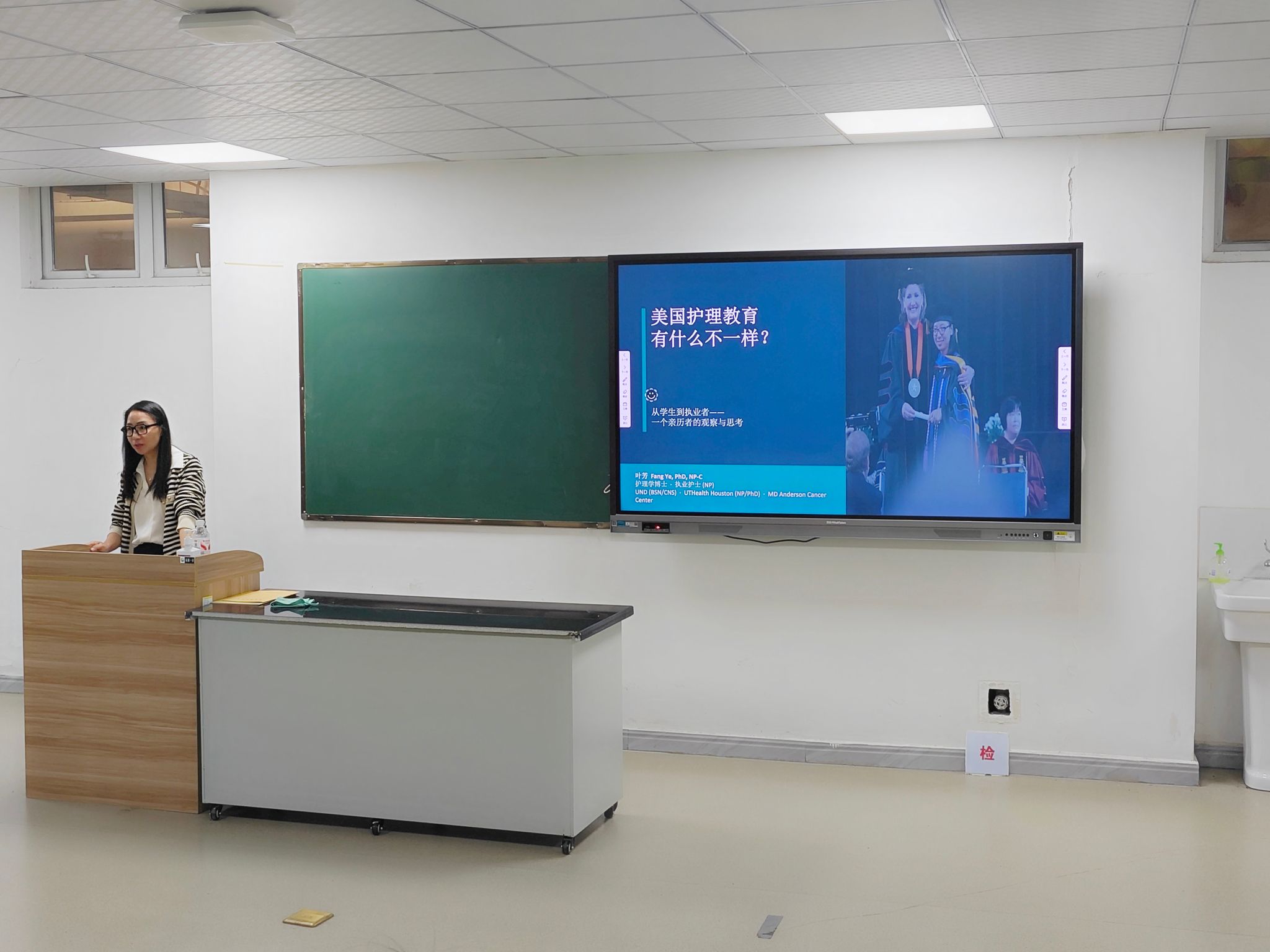 作为护理学院护士节“五个一”系列活动的一环,4月22日中午,叶芳面向护理学院全体教师,做了《美国护理教育特色》分享。在交流中,叶芳剖析了中美护理教育在理论教学与实践训练方面的异同,并强调——护理教育的核心,始终是塑造一个“能真正帮助患者的人”,这一理念也深刻贯穿于整个讲座的始终。