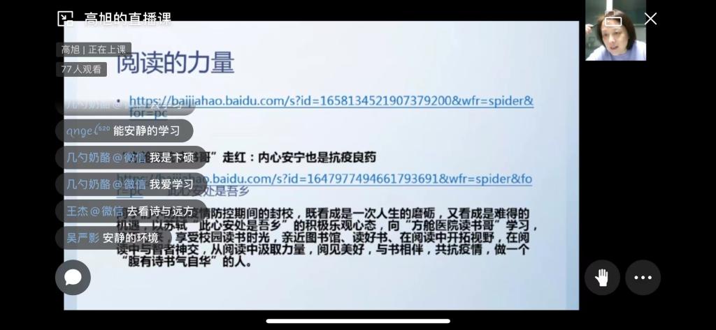高旭首先指出在当前国内疫情呈多点散发与局部爆发态势下,为确保校园平安稳定,加强疫情防控措施实行校园封闭管理的必要性和重要性,回顾了三月初以来学校的疫情防控工作,并列举了若干在疫情防控情况下困扰学生的问题,建议同学们从阅读中汲取力量进行有效的心理调适。随后她和学生们分享了2020年武汉封城期间“方舱医院读书哥”的事例以及宋代词人苏轼的名句“此心安处是吾乡”中所蕴含的人生哲理,勉励同学们以“此心安处是吾乡”的积极乐观心态,向“方舱医院读书哥”学习,静下心来,享受阅读,在阅读中开拓视野,丰富心灵,与书相伴,阅见美好,共抗疫情,做“腹有诗书气自华”的人。最后,高旭向同学们详细介绍了图书馆的图书资源及访问方式,并推荐了三个正在进行中的第八届校园读书节活动。