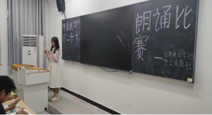 9月12日至18日是第25届推广普通话宣传周,学生社团举办了经典诵读写系列活动。笃学诗友社及百花亭文学社于9月17日在4102教室举行以“推广普通话,喜迎二十大”主题朗诵活动,翰墨书画协会围绕传统文化经典开展了书法作品征集。