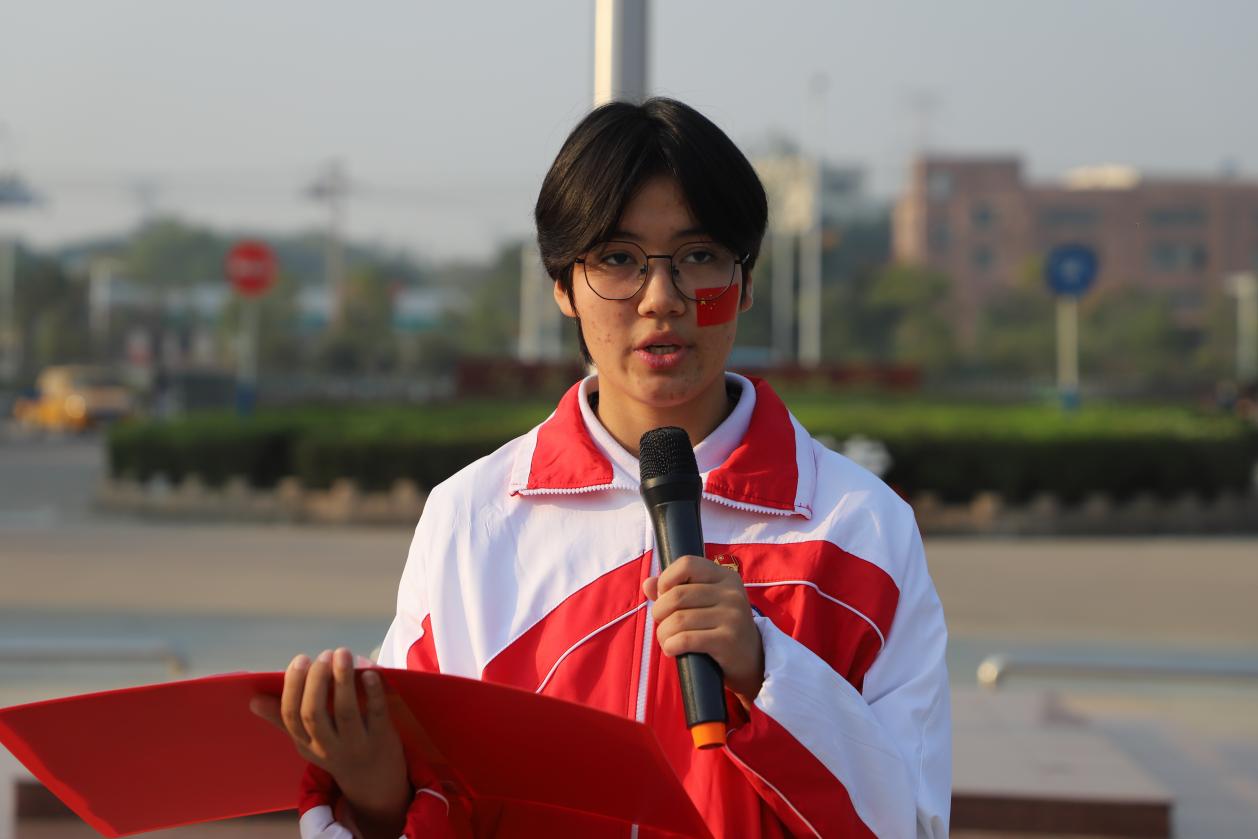 在雄壮豪迈的国歌声中,鲜艳的五星红旗冉冉升起,全体师生肃然静立,凝眸注视,送上了对祖国最美好的祝福。我校中职班学生、青马班成员团员代表热依拉·巴拉特同学做国旗下演讲,她以挺拔的身姿、质朴的话语向祖国表达“请党放心,强国有我”的决心。