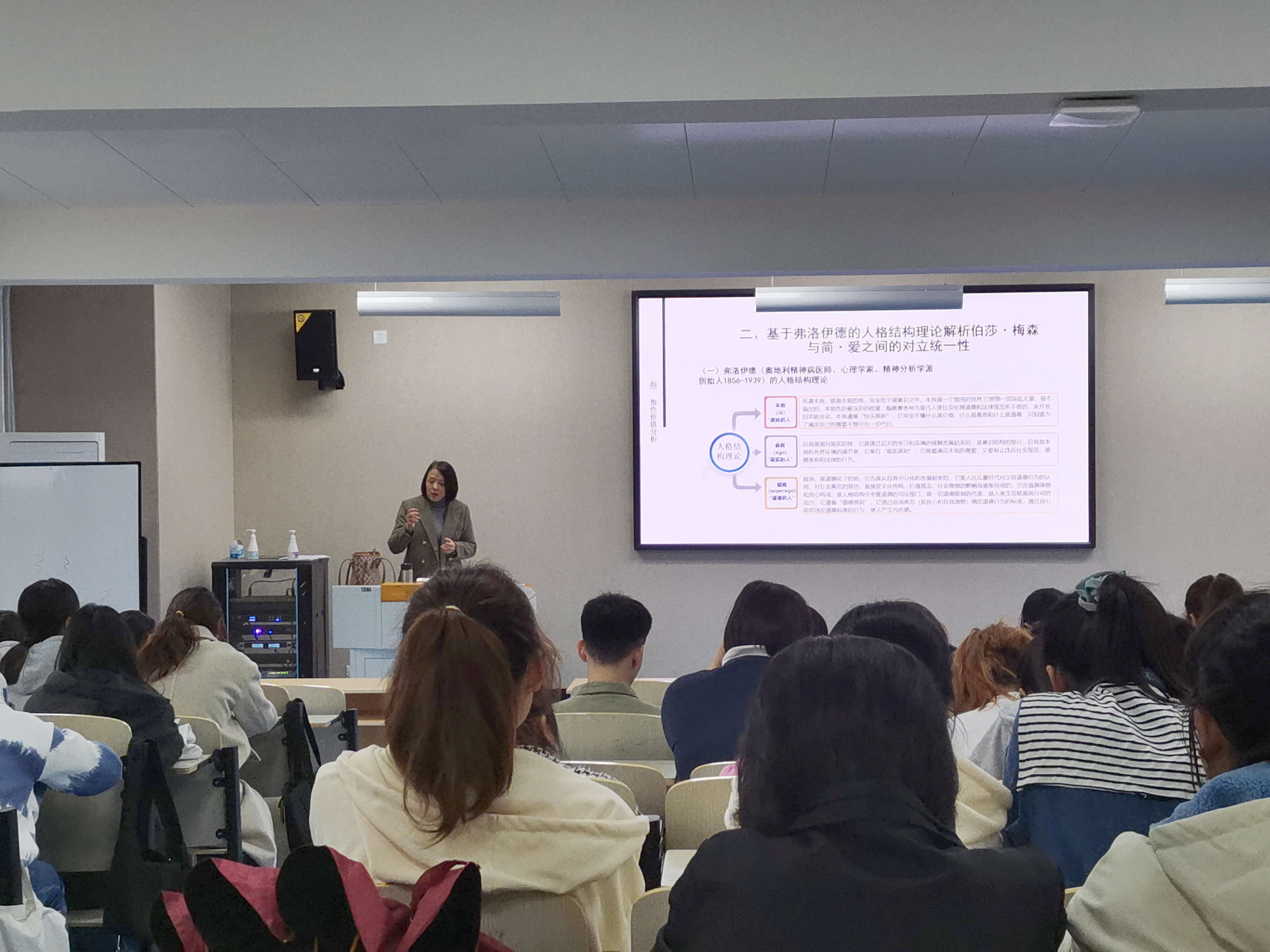 高旭首先提出,在《简・爱》中,伯莎・梅森是一个重要的女性角色,她以被囚禁的疯女人形象出现,没有话语权,读者对她的认识均源自他者的评价及她本人种种疯狂的行径。接着她从弗洛伊德人格构成理论、“歌特式”小说及批判现实主义的三个视角和广大师生们一起探讨了“疯女人”的角色价值,并得出结论:基于弗洛伊德人格结构理论,伯莎・梅森这一角色宣泄了简爱内心隐秘的欲望,是简・爱本我的体现;根据歌特式小说特点分析,伯莎・梅森集中体现了小说的歌特式元素,是作者为了迎合读者阅读心理,推动故事情节发展而精心设计的角色;从批判现实主义的角度出发,伯莎・梅森的悲剧有力鞭挞了十九世纪功利式婚姻并表达了女性的反抗精神。最后高旭向同学们推荐了三个正在进行中的第九届校园读书节活动。讲座现场反响热烈,同学们纷纷表示受益匪浅。