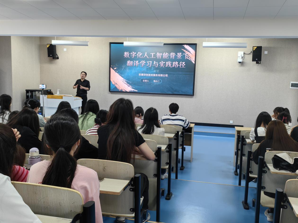 5月17日下午,来自安徽译创语言服务有限公司的执行总监朱小二为我校学子带来了“首届图书馆论坛”第二期第二场讲座:“数字化人工智能背景下翻译学习与实践路径”。他首先介绍了中国语言服务需求类型,随后用视频分别从文献检索、词典资源、机器翻译、视频自动翻译、口语自动评测、ChatGPT等方面向同学们演示了数字化人工智能语言产品对现有语言服务行业的影响,并从行业达人的角度指出社会需要一专多能的复合型人才,启迪同学们思考如何立足专业拓展就业渠道。