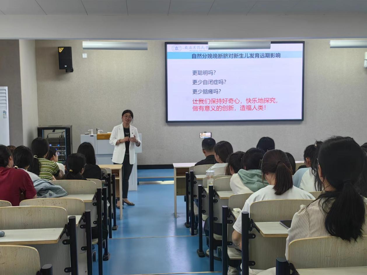 路红春首先阐述了晚断脐的定义、意义及具体操作规程,随后她结合大量研究数据详述了晚断脐实施的重要性、晚断脐对新生儿发育的影响并系统介绍了国内外的最新研究进展。讲座条理清晰,内容丰富,把深奥的学术研究以简洁明了的示例和讲解呈现在学生面前,听众收获满满。