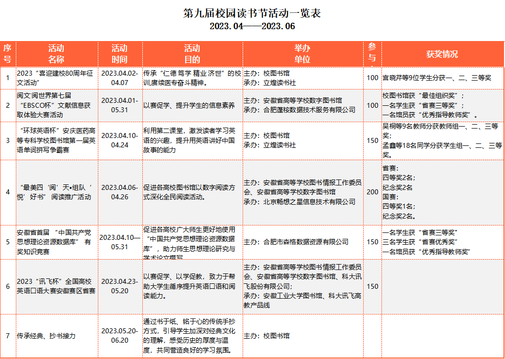 为深入贯彻党的二十大关于深化全民阅读活动的重要部署,引导激励全校师生爱读书、读好书、善读书,大力营造浓厚的读书氛围,推动“书香校园”建设,自4月23日第九届校园读书节活动启动至6月20日,校图书馆成功组织了7次阅读推广活动,并在3项图书馆业内省级赛事中荣获佳绩。